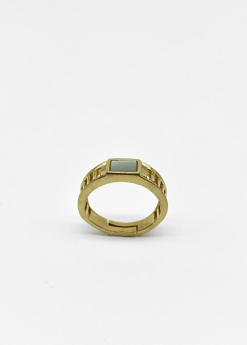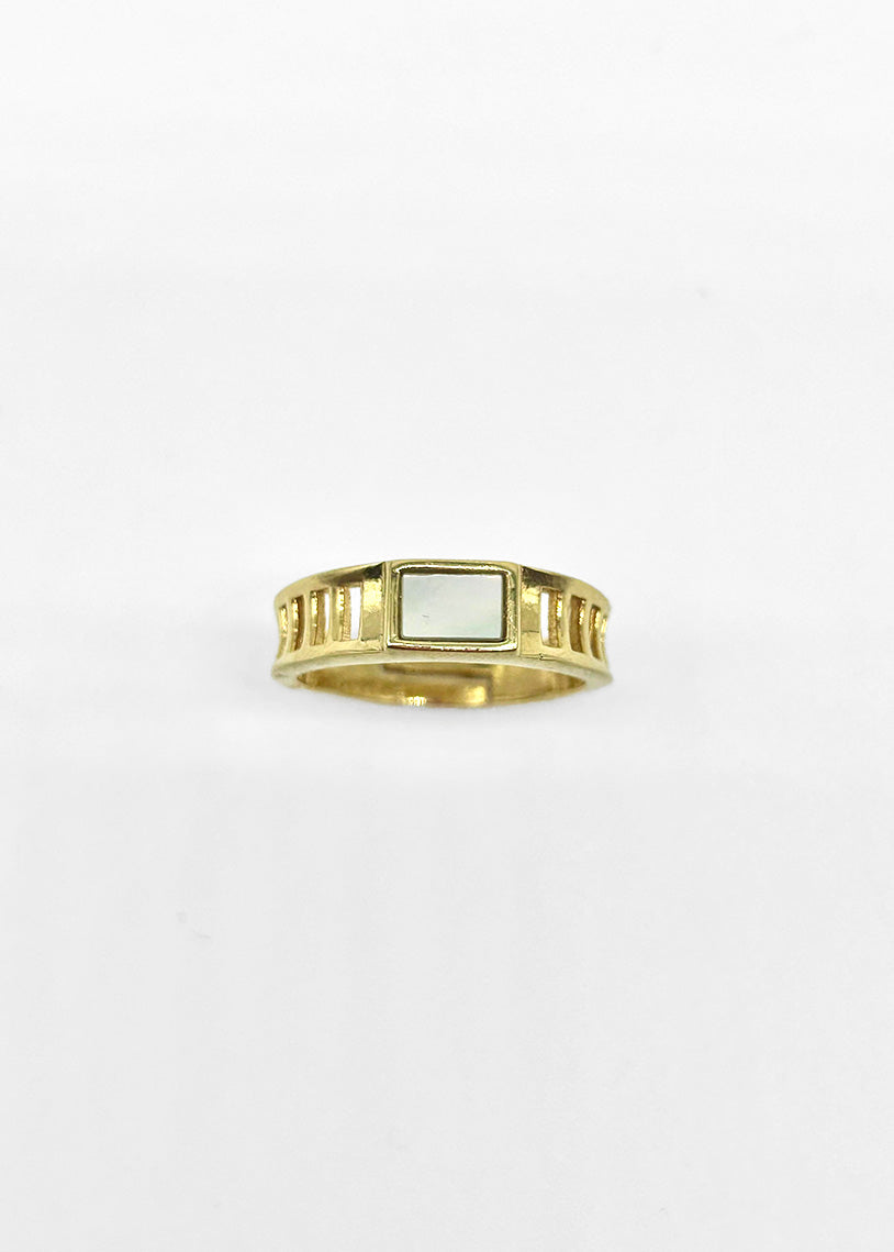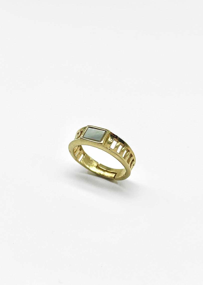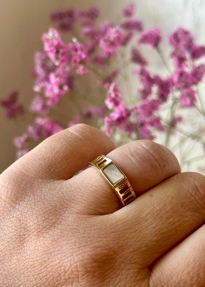 L'anello regolabile a fascia Creta unisce l'eleganza della madreperla a una raffinata finitura galvanica dorata. Il design versatile e regolabile garantisce una vestibilità confortevole, mentre la madreperla dona un tocco di luminosità naturale e sofisticata. Perfetto per chi desidera un accessorio prezioso che coniughi stile classico e modernità con un'eccellente qualità artigianale.