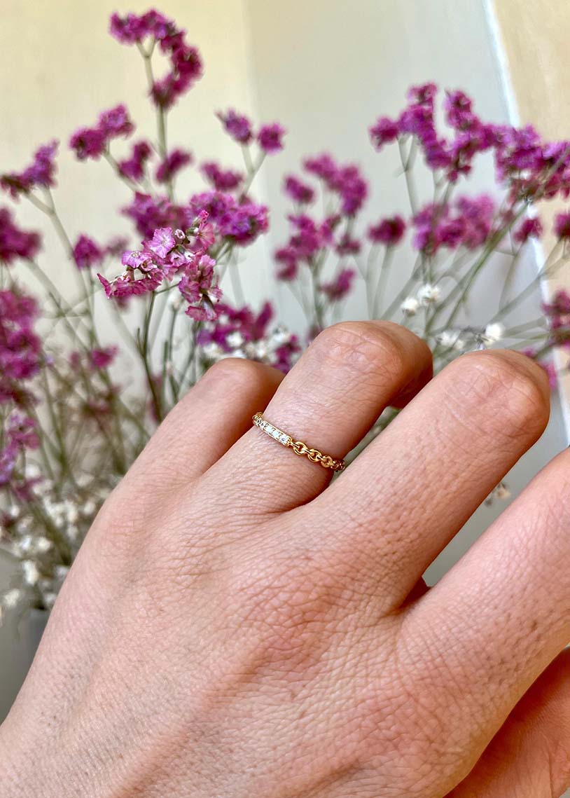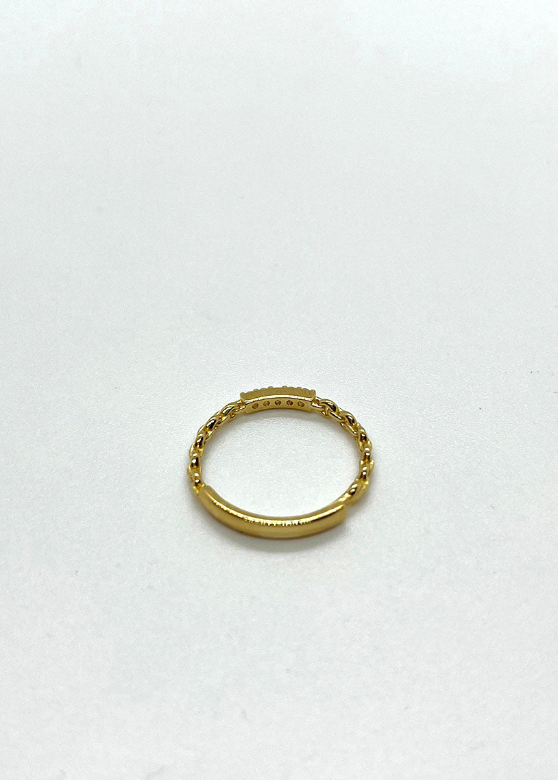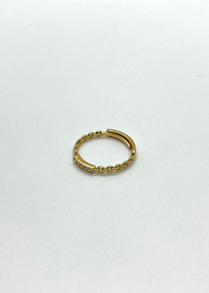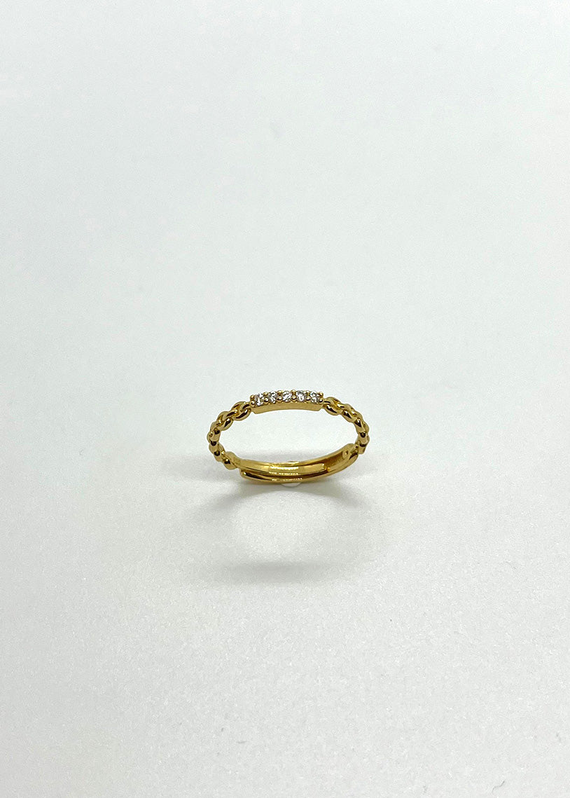 L'anello regolabile Mia presenta una fascia elegante arricchita da cinque cubic zirconia scintillanti, incastonati su una catena a intreccio raffinata con galvanica dorata. Questo gioiello unisce design sofisticato e brillantezza, offrendo un accessorio versatile e prezioso, ideale per chi cerca un tocco di classe e luminosità in ogni occasione.