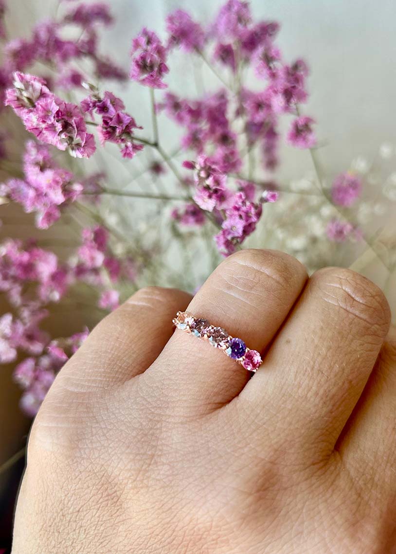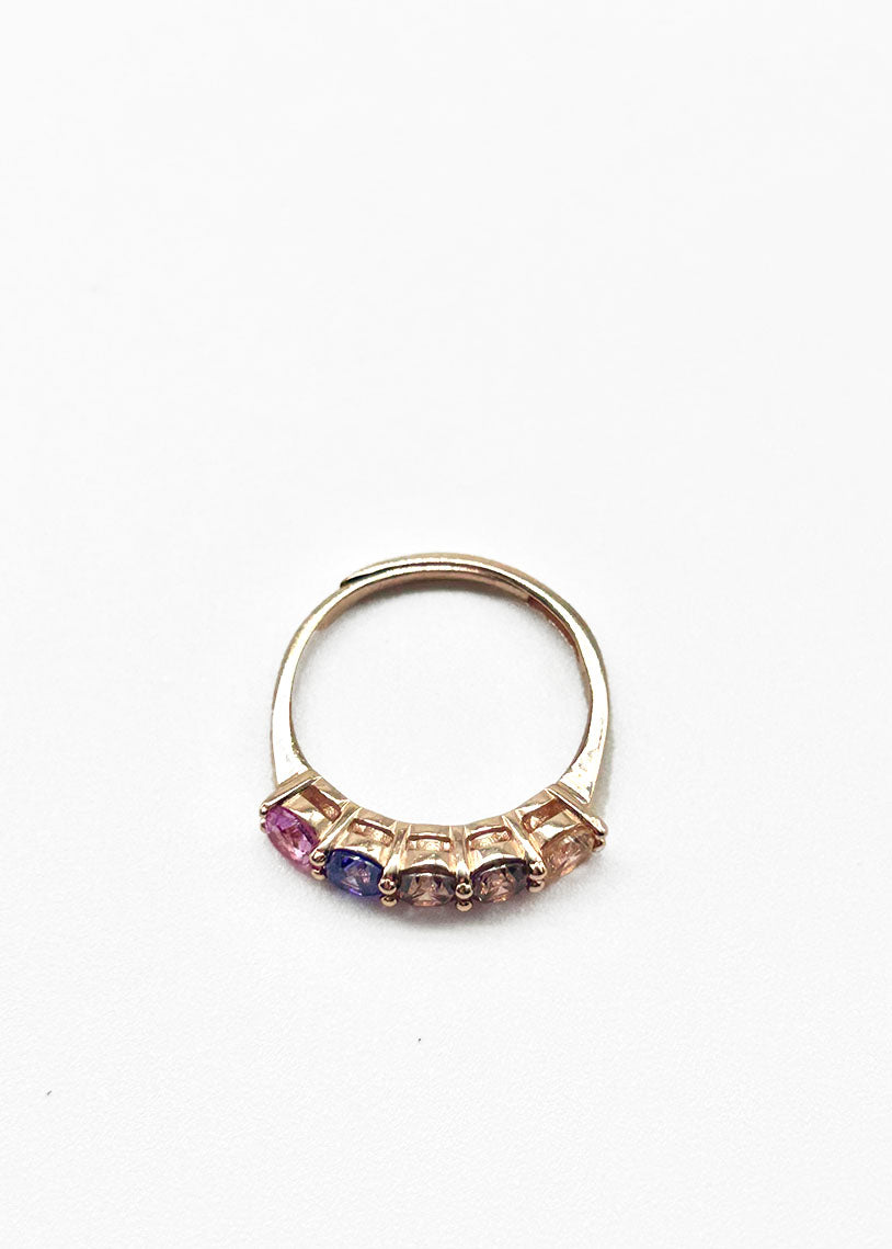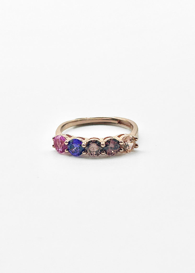 L'anello Riviera Rainbow si distingue per i suoi cinque cubic zirconia colorati, ciascuno selezionato per la brillantezza e la vivacità del colore. La raffinata galvanica rosé conferisce all’anello un aspetto sofisticato e contemporaneo, rendendolo un accessorio versatile e di grande impatto estetico. Perfetto per chi desidera un gioiello che unisca eleganza e un tocco di colore, adatto sia a occasioni formali che a momenti di quotidianità.