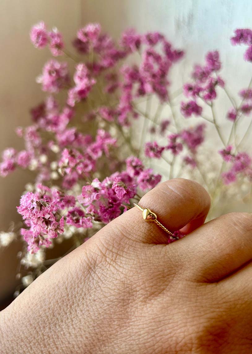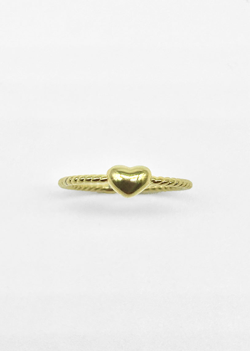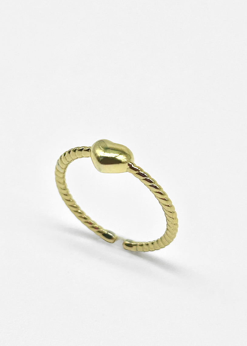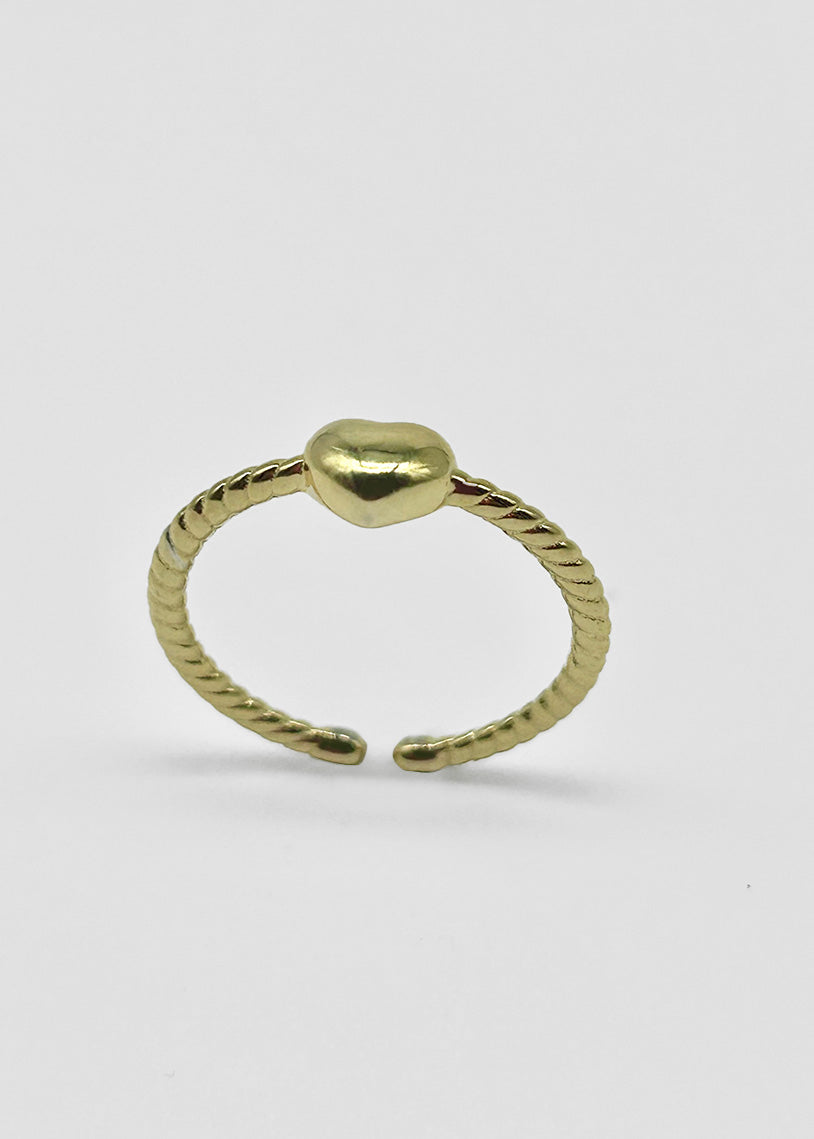 La fedina regolabile Samy presenta un design torchon con un cuore centrale, combinando semplicità e leggerezza. Realizzata con galvanica gold, offre una finitura elegante e resistente, ideale per chi cerca un anello versatile e raffinato da indossare ogni giorno.