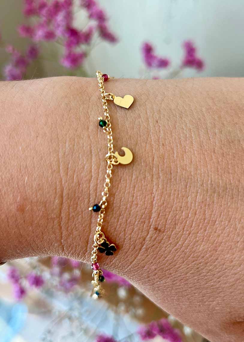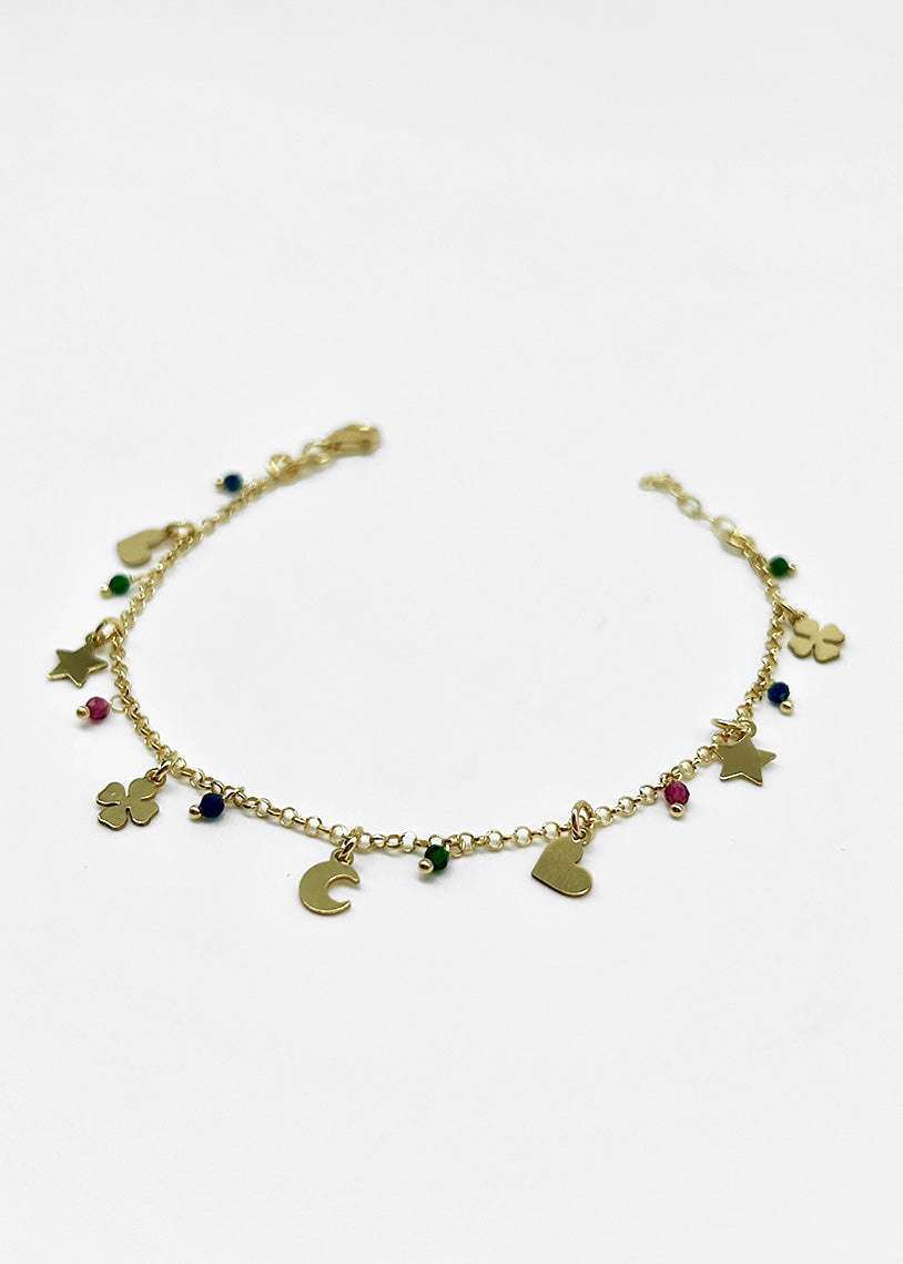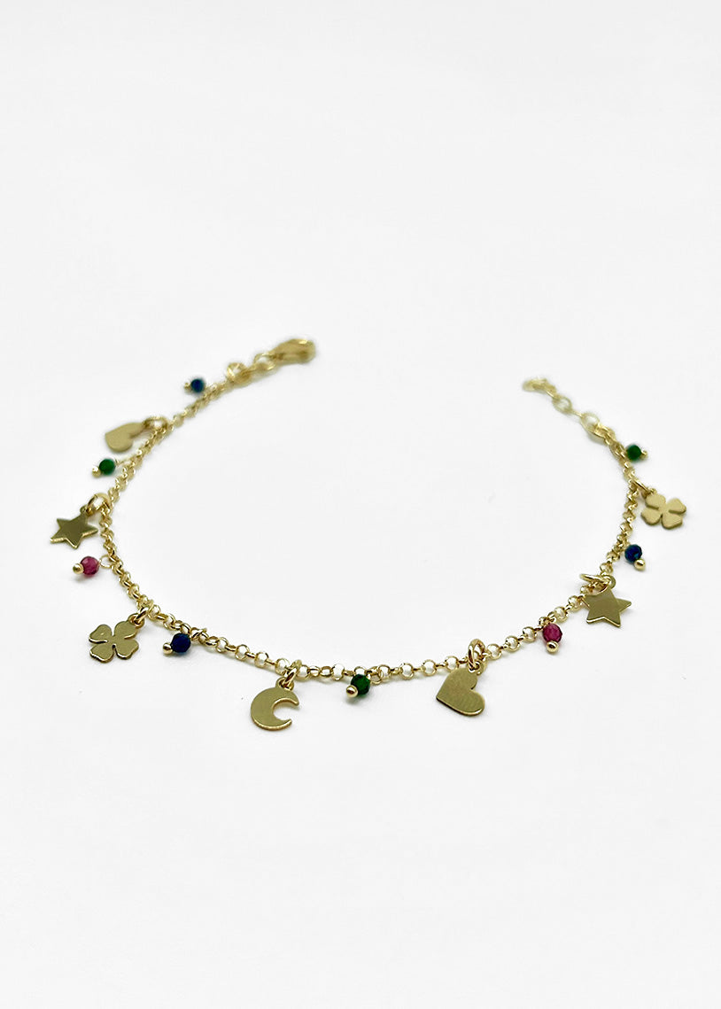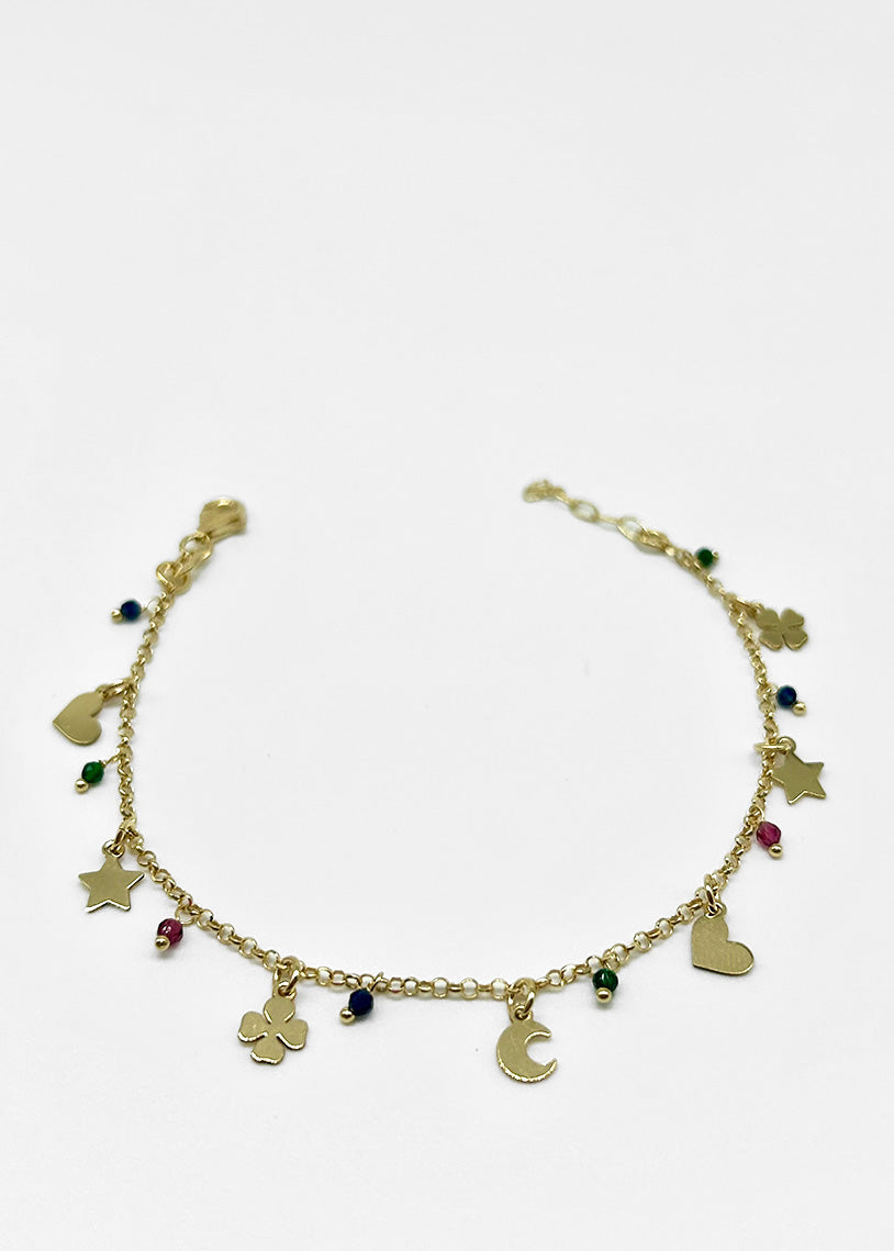 Funny è un braccialetto vivace e dinamico, arricchito da una selezione di ciondoli colorati che donano un tocco di allegria e personalità a chi lo indossa. La finitura in galvanica dorata non solo conferisce un aspetto luminoso e raffinato, ma assicura anche una maggiore resistenza nel tempo. Questo accessorio è ideale per chi desidera esprimere uno stile giocoso e distintivo, perfetto per completare sia look casual che più ricercati con un dettaglio unico e sofisticato.