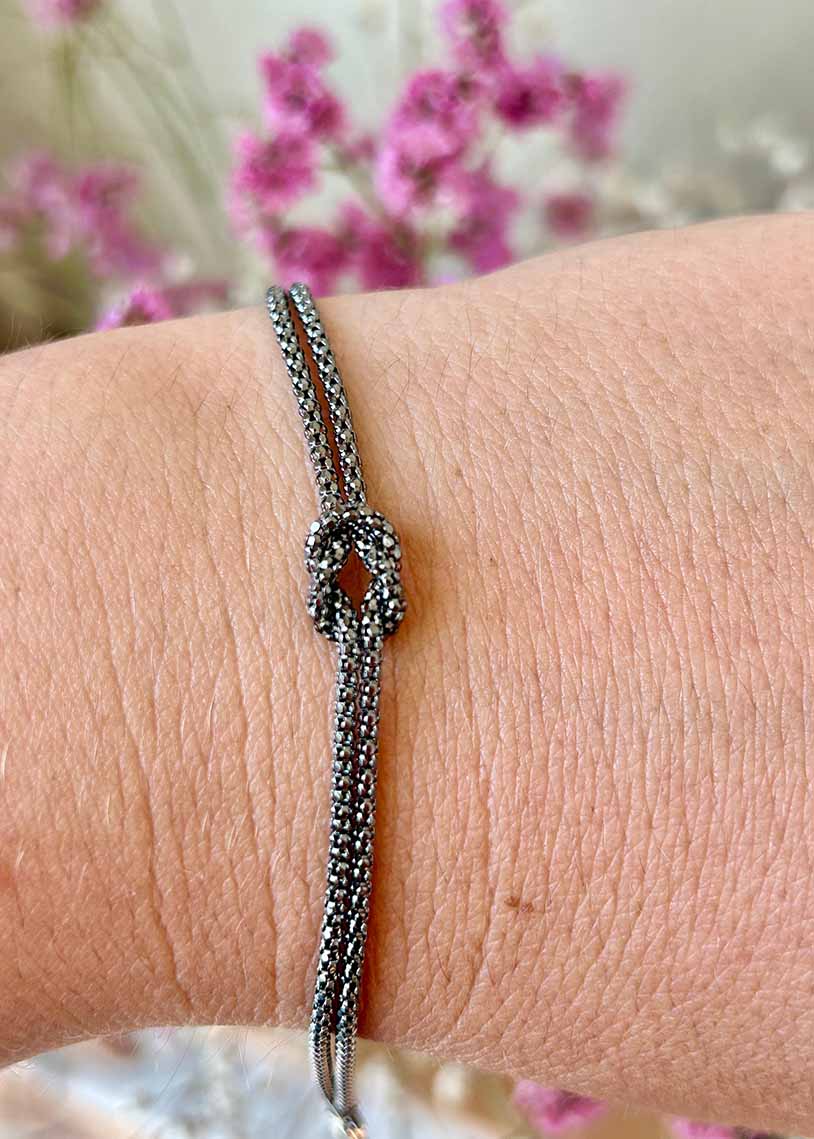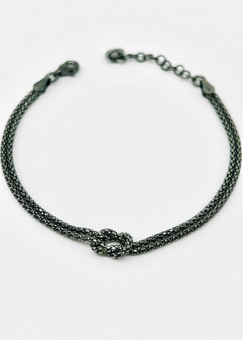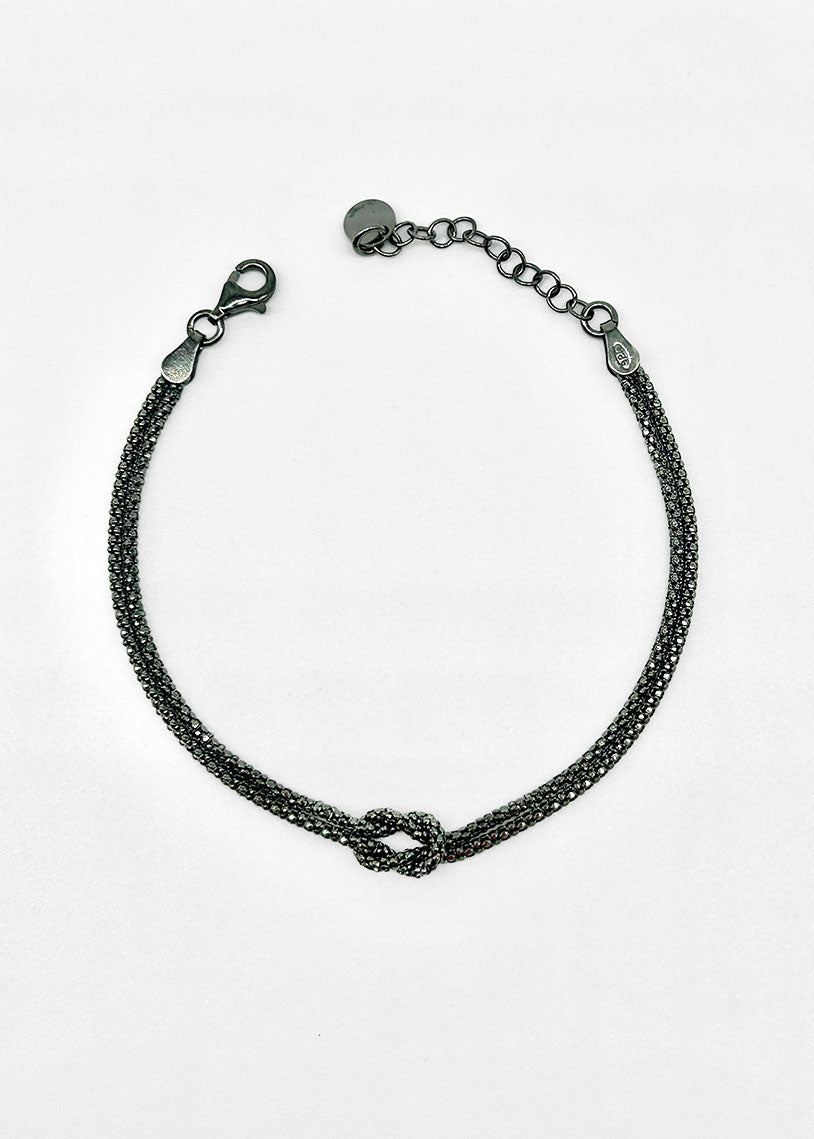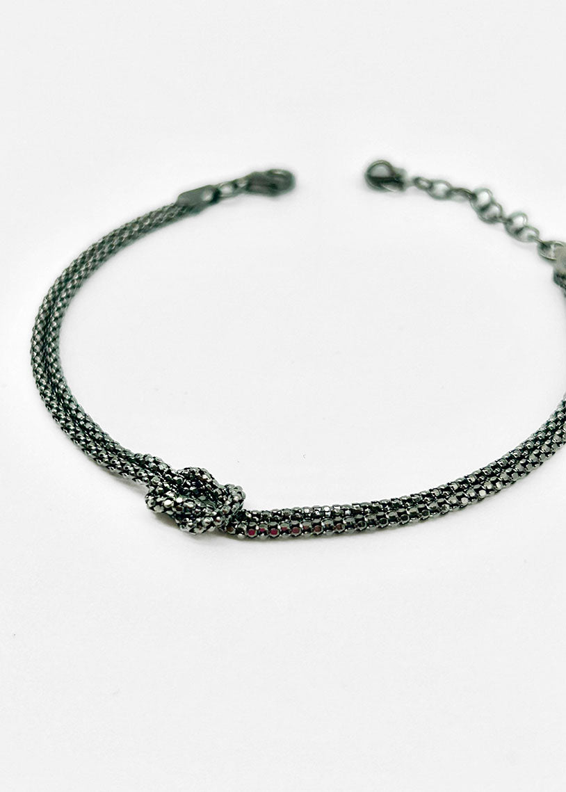 Nodo rappresenta un braccialetto unico, con un nodo che incarna i legami intensi di affetto, unione e amicizia. La raffinata finitura in galvanica rutenio dona al gioiello un’eleganza senza tempo e una resistenza prolungata, perfetta per chi cerca un accessorio prezioso e significativo.