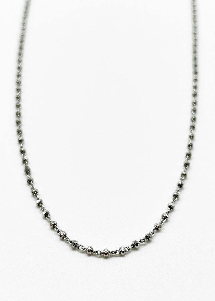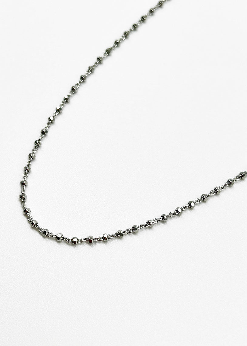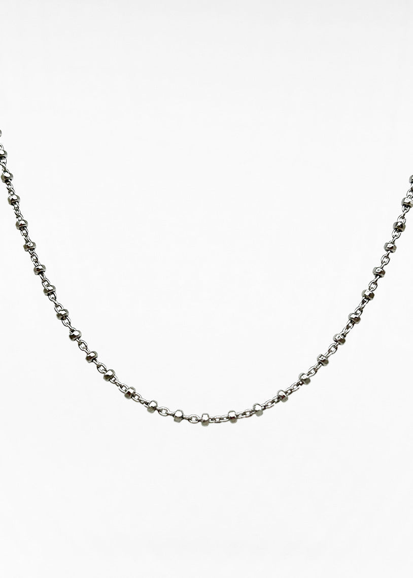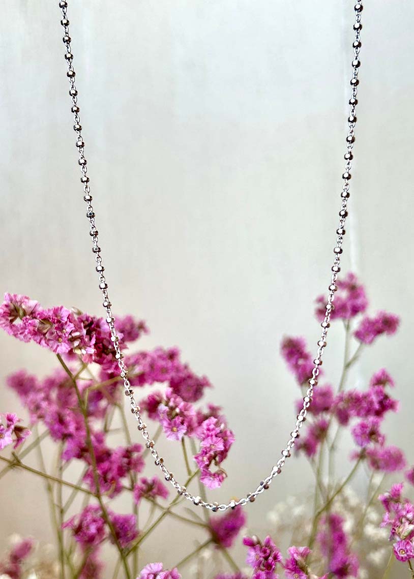 La catena Calliope White in argento 925 presenta una maglia intrecciata elegante, impreziosita da sfere decorative sfaccettate in galvanica rodio. Questo gioiello combina resistenza e stile contemporaneo, ideale per chi desidera un accessorio raffinato e luminoso, perfetto per completare con classe ogni look.