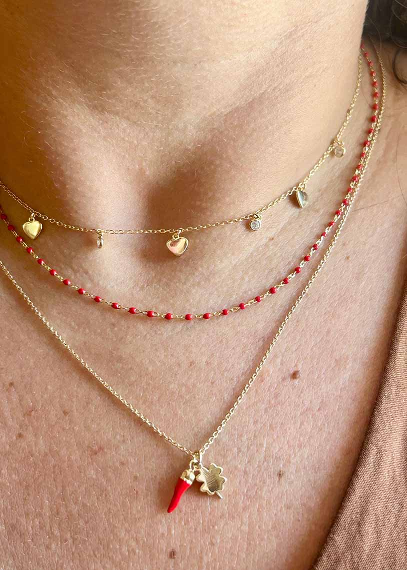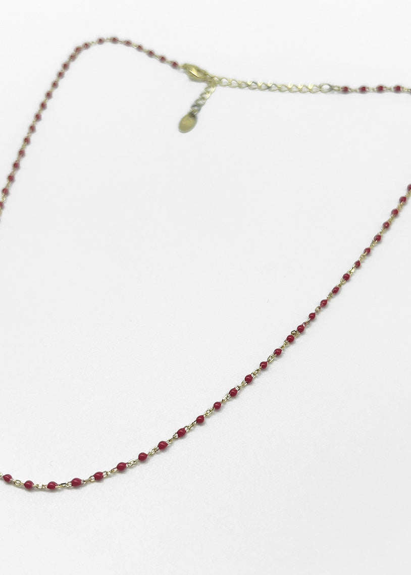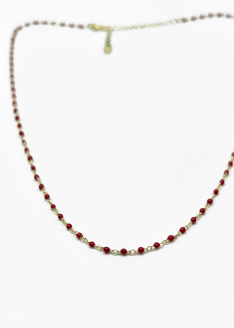 Il girocollo Cherry unisce eleganza e vivacità grazie al suo smalto rosso brillante e alla raffinata galvanica color oro. Questo gioiello dal design fresco e frizzante valorizza ogni outfit con un tocco di colore sofisticato, ideale per chi cerca un accessorio distintivo e di qualità. Realizzato con cura, garantisce durata e stile senza tempo.