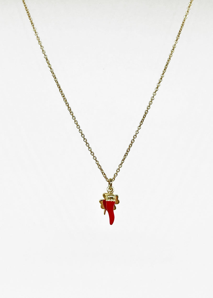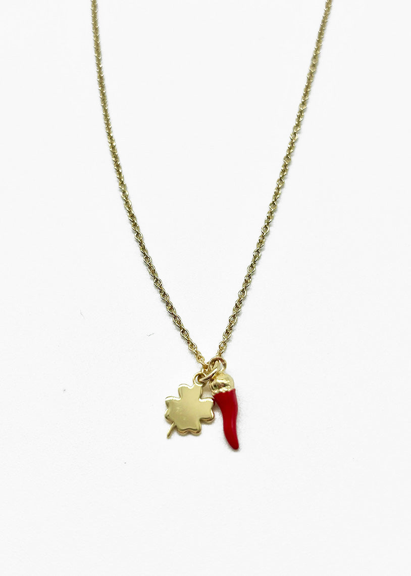 La collana Lucky combina eleganza e simbolismo con i suoi ciondoli portafortuna: un quadrifoglio e un cornetto rosso, entrambi rifiniti con una raffinata galvanica dorata. Questo gioiello unisce stile e significato, perfetto per chi desidera indossare un amuleto di buon auspicio con un tocco di classe. Realizzata con materiali di alta qualità, garantisce resistenza e brillantezza nel tempo.
