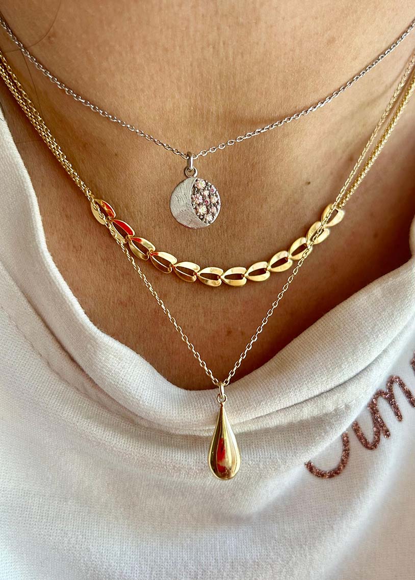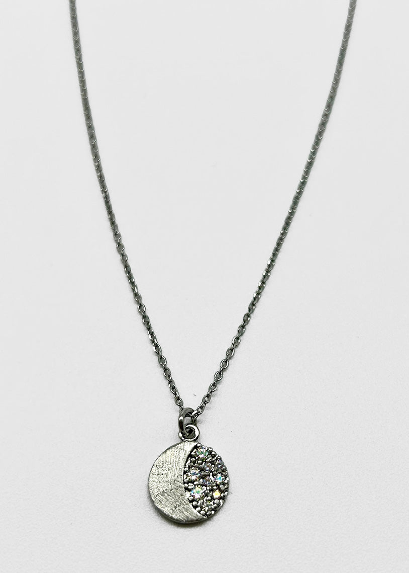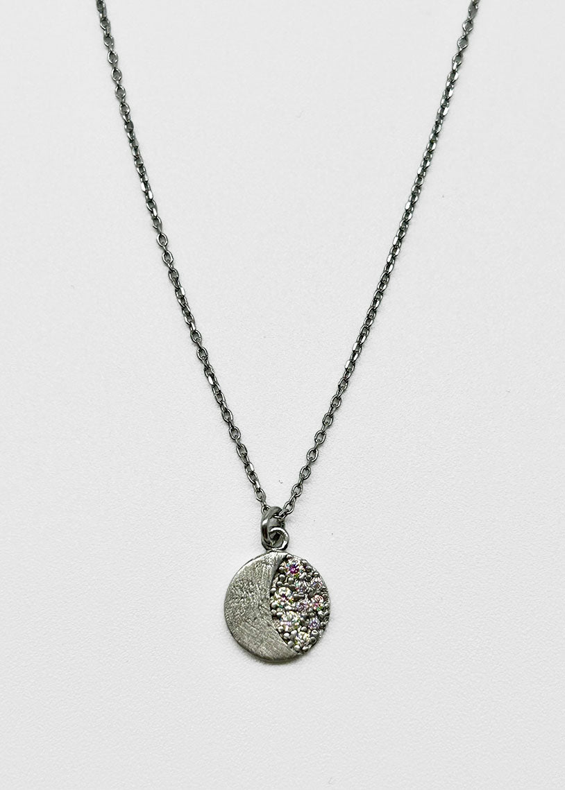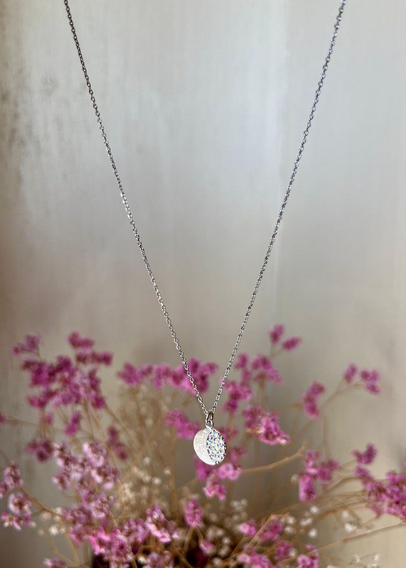 Girocollo Selene White: eleganza lunare in ogni dettaglio. La collana presenta una raffinata catena a maglia micro rolò, delicata e versatile, impreziosita da un ciondolo a forma di luna satinata. I cubic zirconia cangianti catturano la luce con riflessi mutevoli, creando un gioco di brillantezza sofisticato. La galvanica white garantisce una finitura luminosa e duratura nel tempo. Un accessorio che unisce design contemporaneo e simbolismo affascinante, perfetto per chi ricerca gioielli dal carattere distintivo e dalla qualità artigianale.