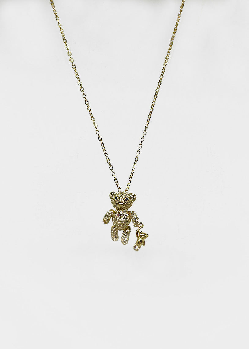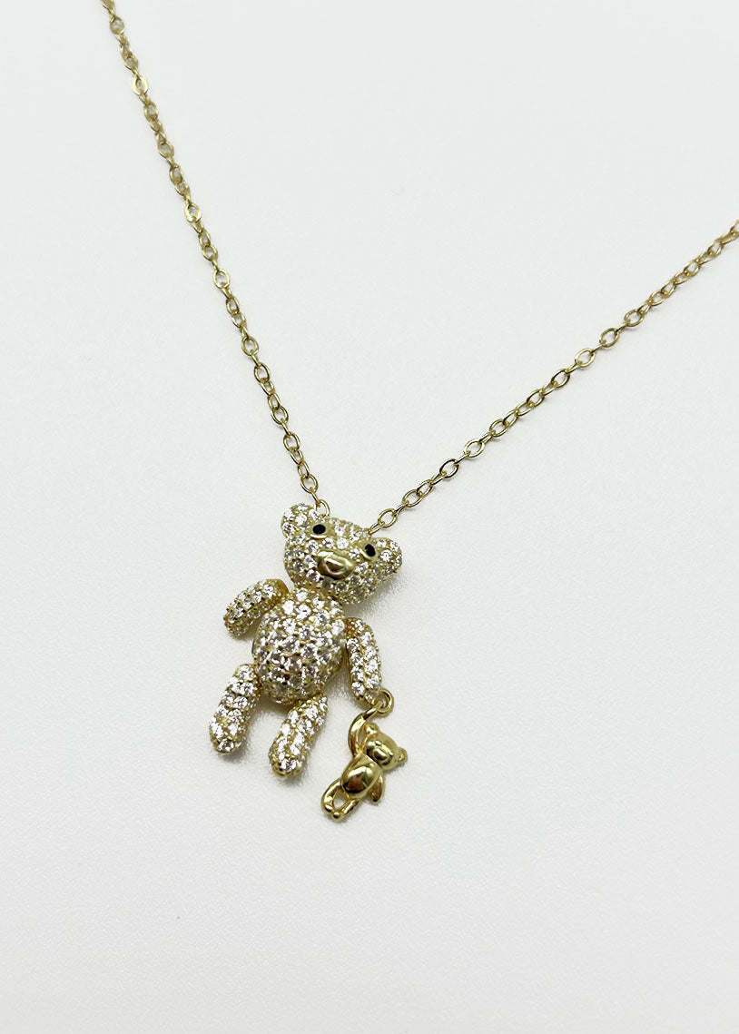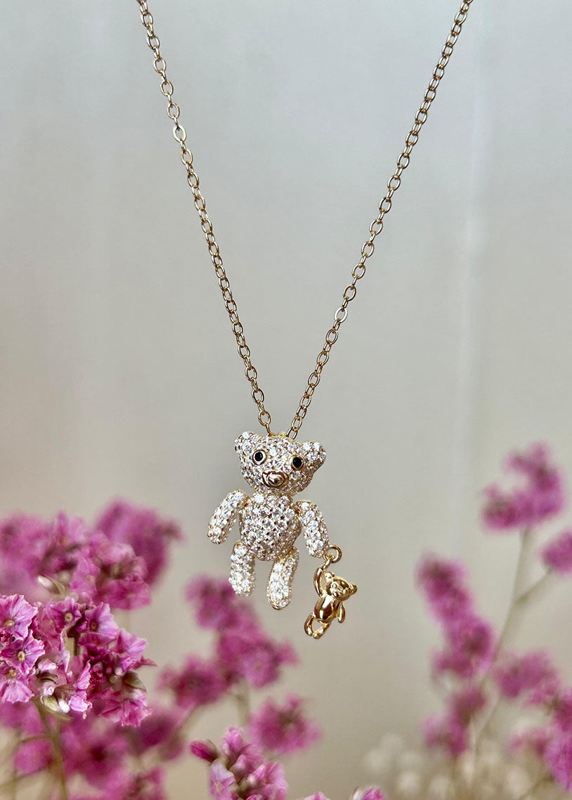 Questo girocollo Teddy unisce eleganza e dolcezza grazie alla sua raffinata lavorazione in galvanica gold. Il ciondolo a forma di orsetto è tempestato di pavé di cubic zirconia, che conferiscono una luminosità intensa e un effetto scintillante. Un accessorio prezioso e versatile, ideale per chi cerca un tocco di stile sofisticato con un design giocoso e contemporaneo.