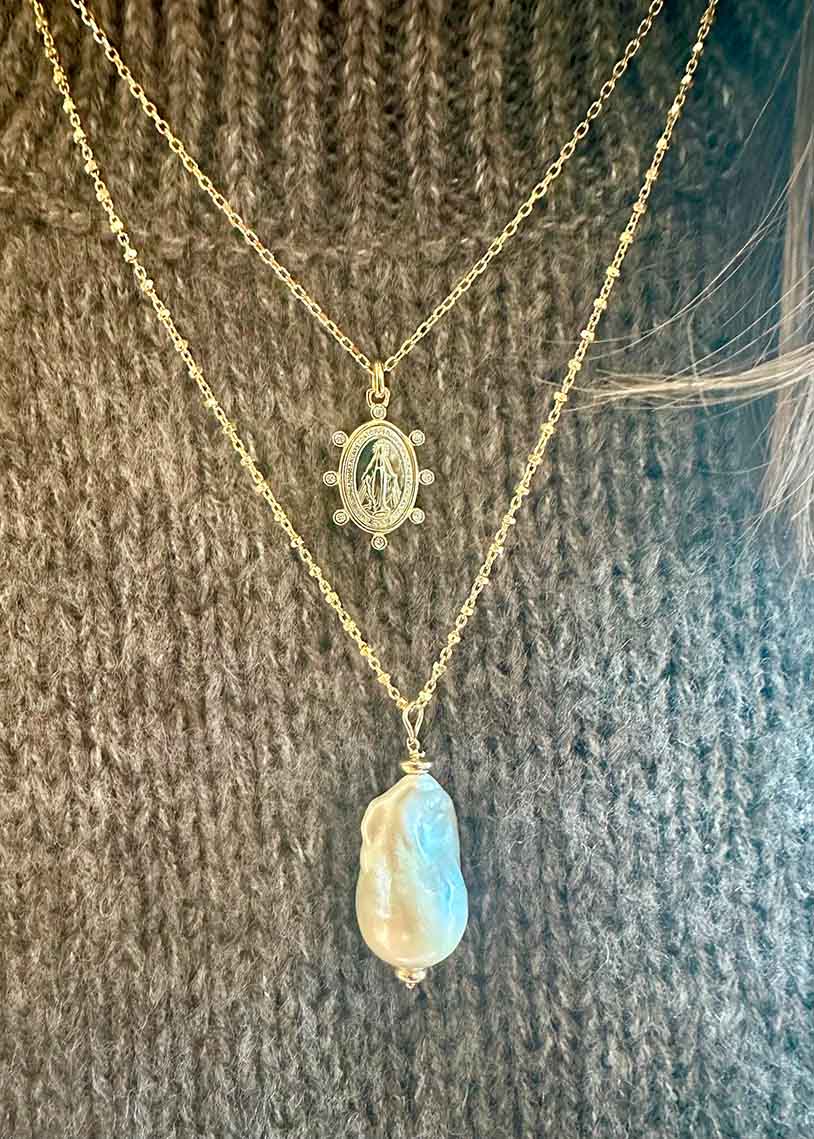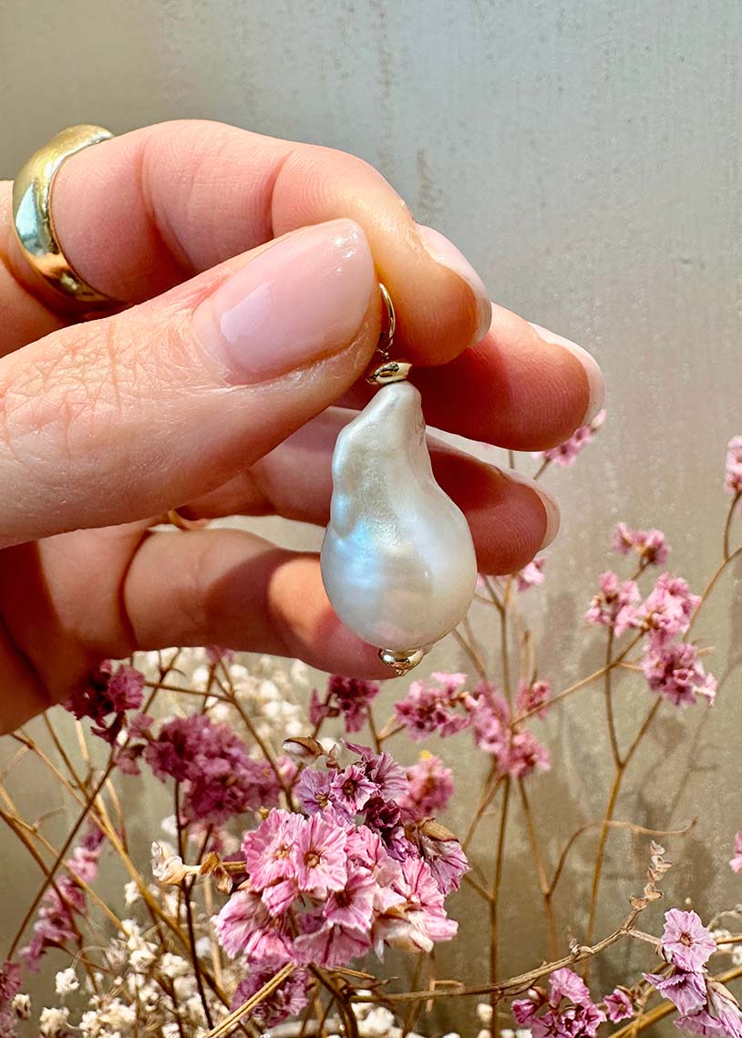 Belle è un ciondolo con perla scaramazza di fiume, impreziosito da una montatura in argento 925 con placcatura gold. La sua versatilità consente molteplici interpretazioni: abbinato a una catena lunga crea un layering raffinato e dinamico, mentre indossato come choker con cordino assume un carattere più contemporaneo e informale. In entrambe le configurazioni mantiene un'eleganza consapevole, lontana da soluzioni convenzionali. Un pezzo che si adatta a diverse espressioni stilistiche senza compromessi sulla qualità costruttiva.