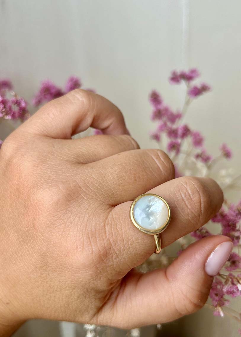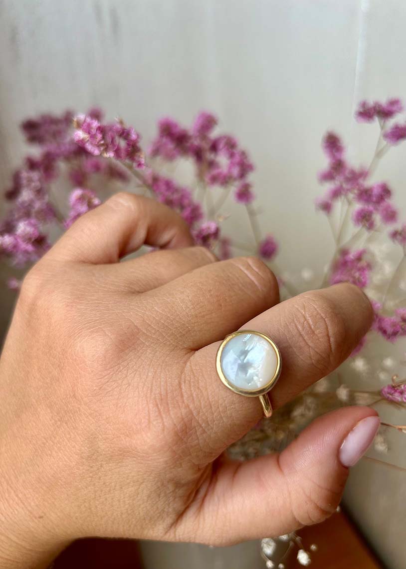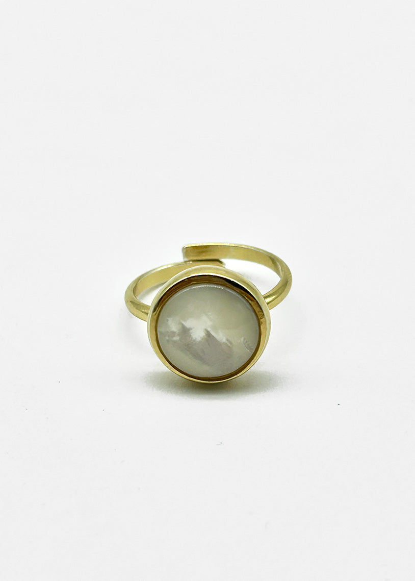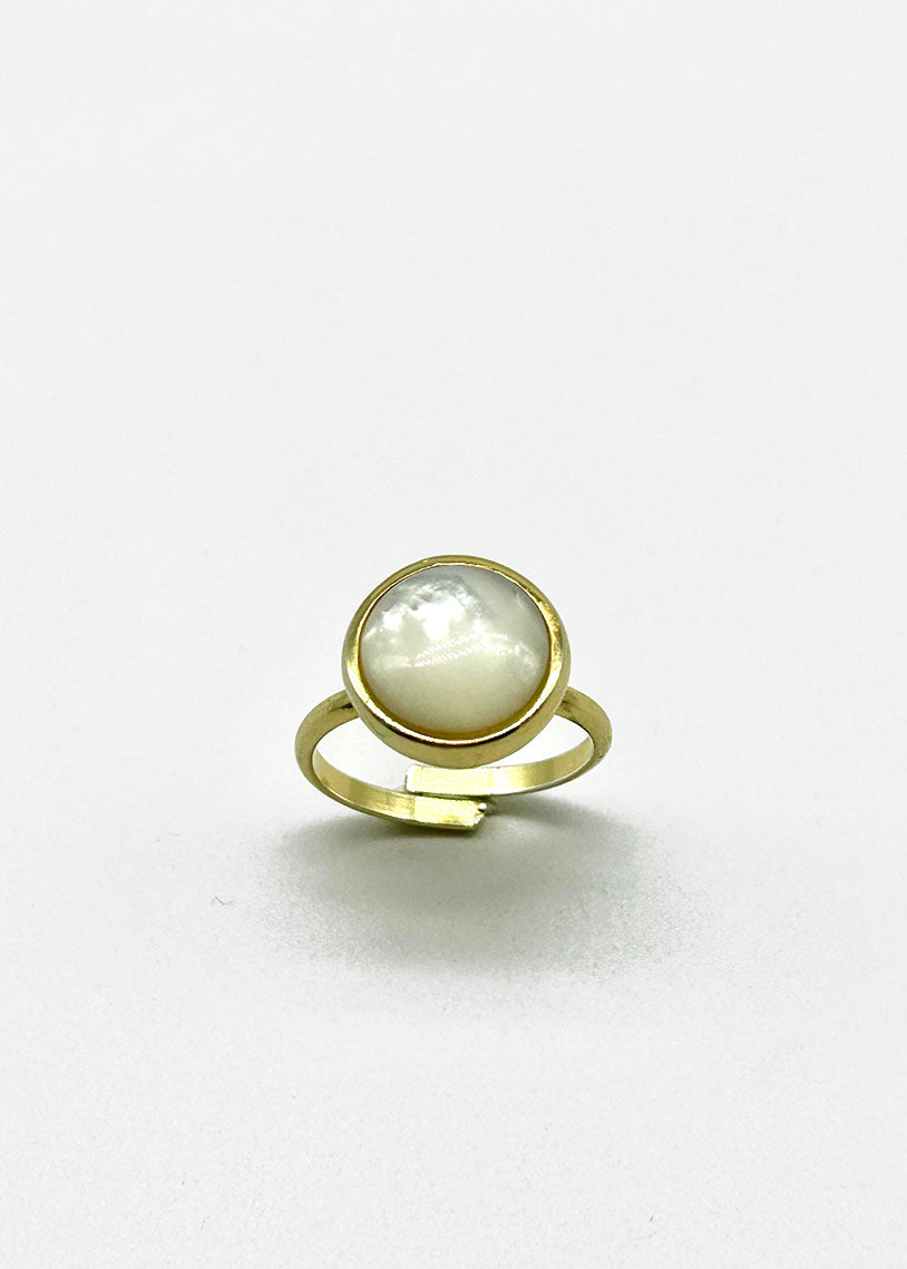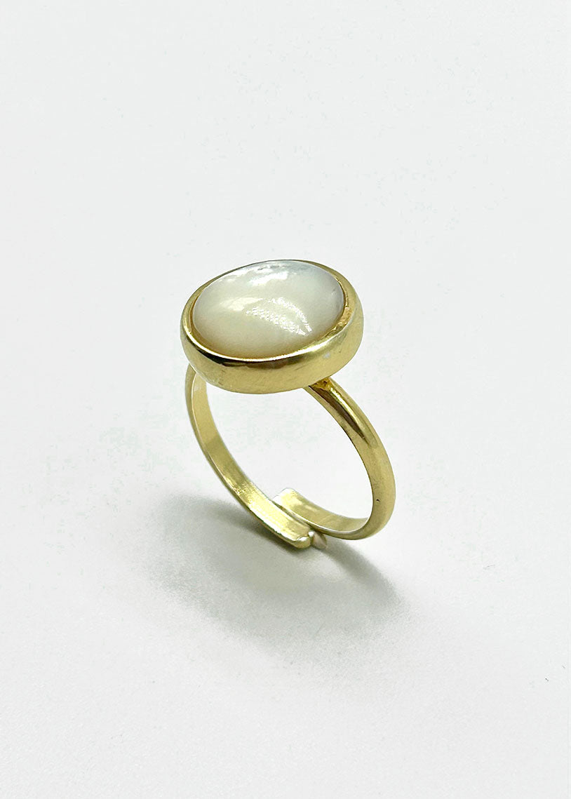 L'anello Heather, raffinato nella sua galvanica oro, presenta un elemento centrale in madreperla incassato con montatura a cabochon che valorizza la sua lucentezza naturale. La misura regolabile garantisce comodità e adattabilità. Un gioiello elegante e versatile, perfetto per chi cerca stile e qualità in ogni dettaglio.