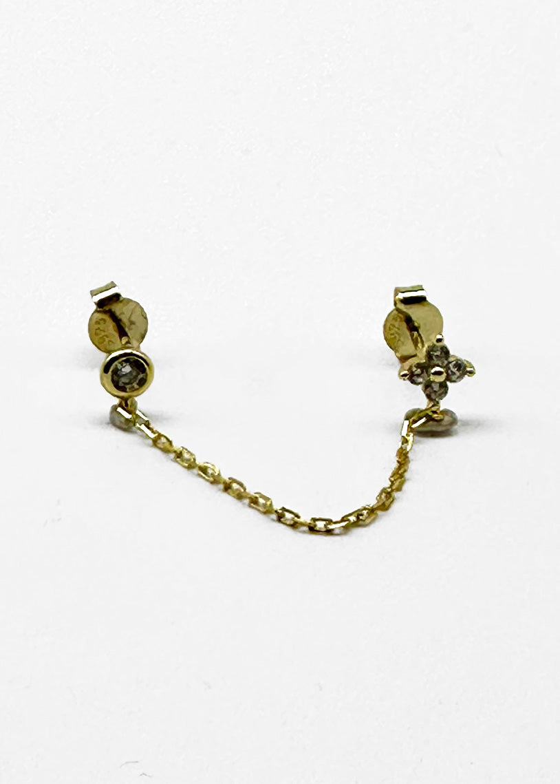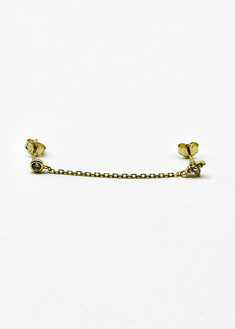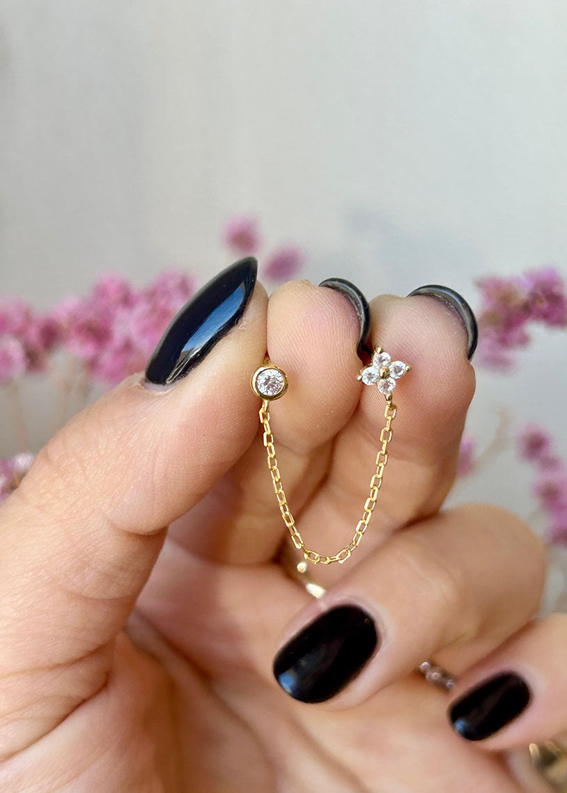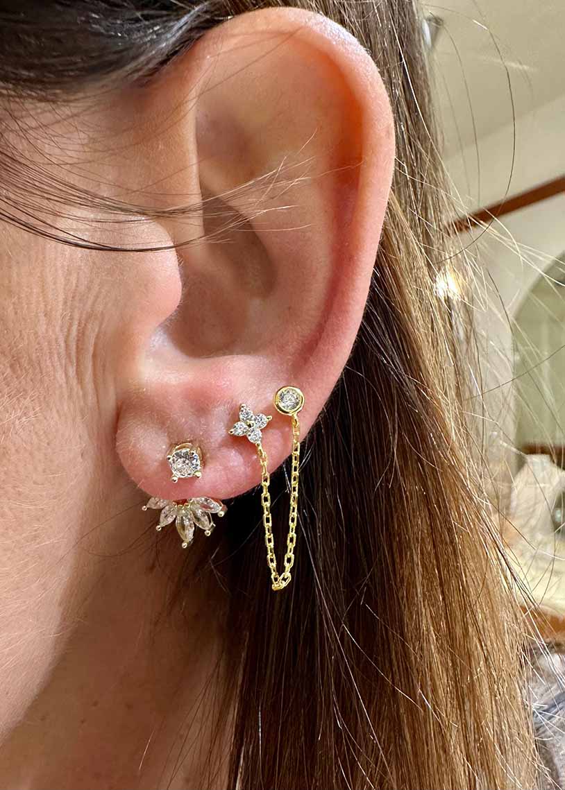 Luce è un mono orecchino pensato per chi possiede almeno due forature all'orecchio, permettendoti di sfruttare appieno la sua versatilità. La catena integrata offre infinite possibilità creative per comporre ear set originali e attuali. Caratterizzato da un delicato fiorellino in cubik zirconia con taglio marquise e da un punto luce montato in basel setting, che conferiscono luminosità e eleganza al pezzo. Realizzato in galvanica gold, questo gioiello combina sofisticatezza e contemporaneità, trasformando il tuo look con stile e personalità.