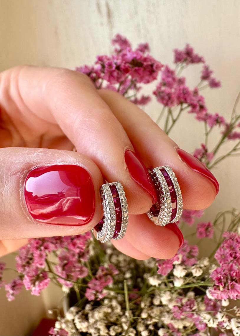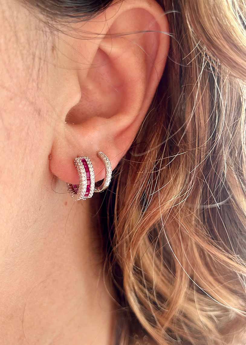 Gli orecchini Cosmopolitan sono cerchietti decorati con cubic zirconia rossi, che offrono un’eleganza distintiva e una lucentezza raffinata. Perfetti per chi cerca un accessorio elegante e versatile, capaci di valorizzare ogni outfit con un tocco di brillantezza sofisticata.