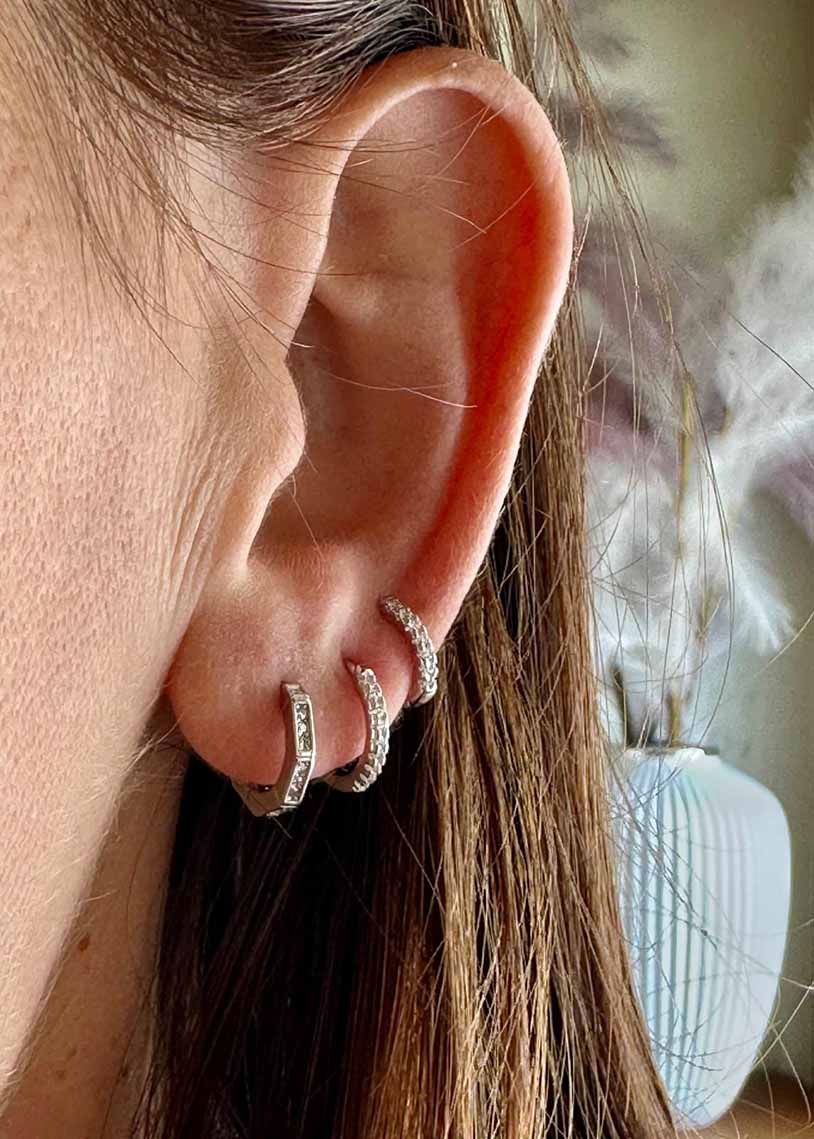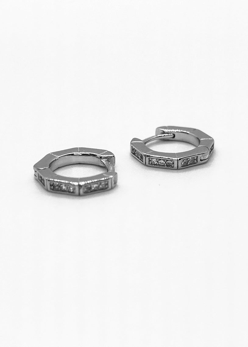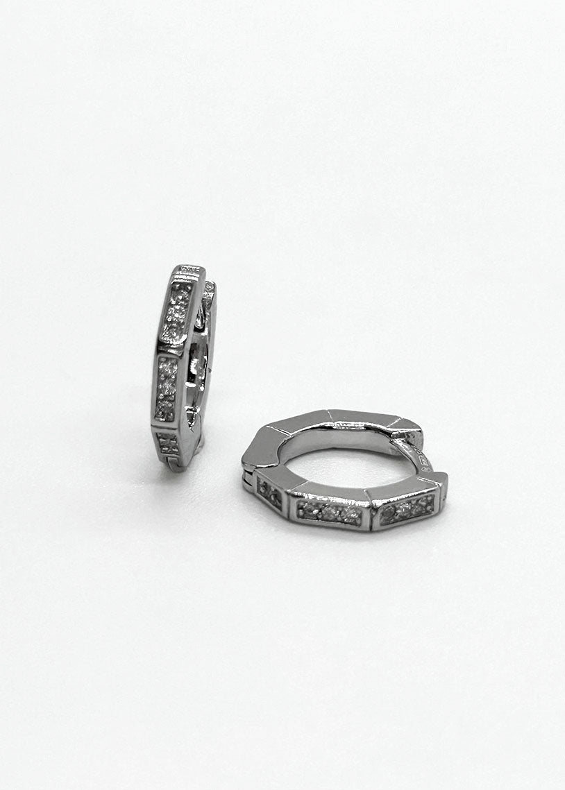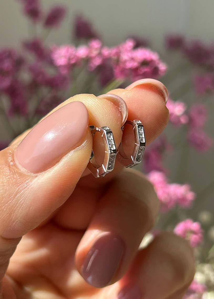I cerchietti Geometric White presentano una forma esagonale arricchita da cubic zirconia e una raffinata finitura in galvanica rodio, combinando design moderno e brillantezza elegante.
