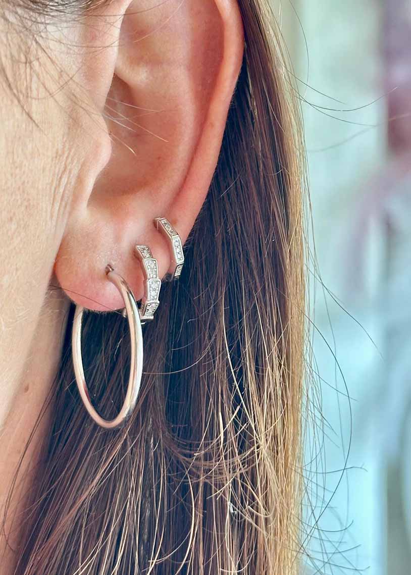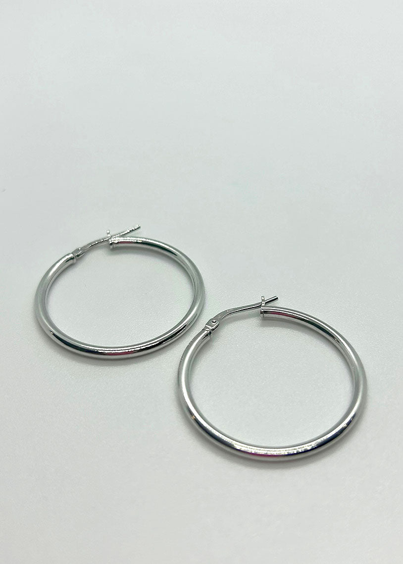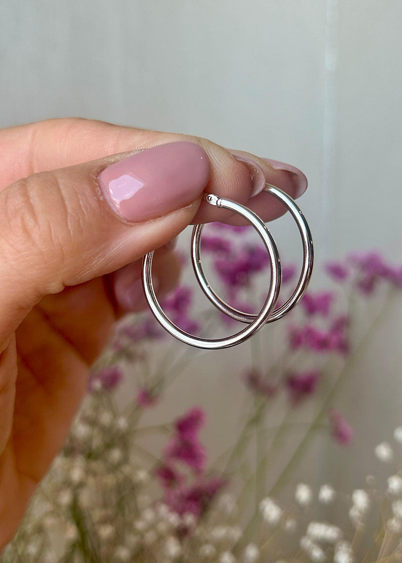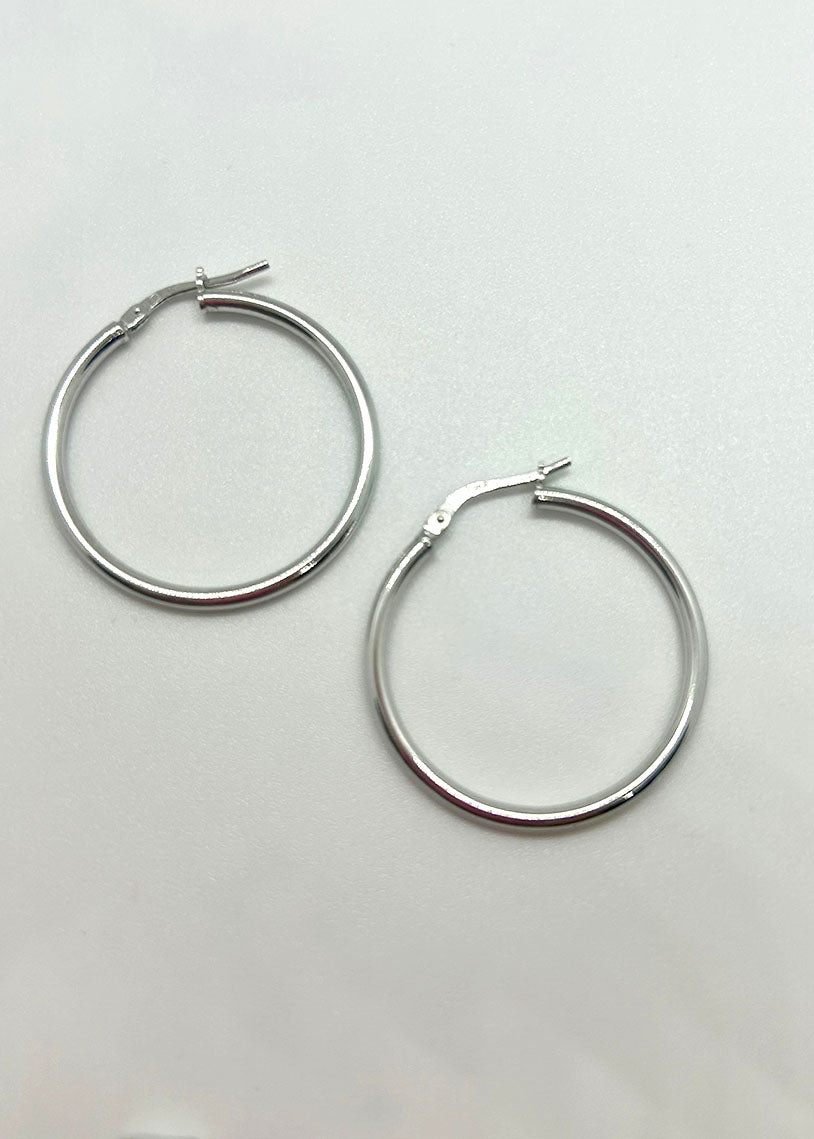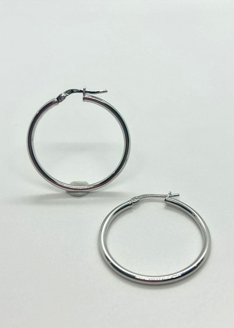 Kenya White è un cerchio sottile e liscio con finitura galvanica in rodio, dal diametro di 2,91 cm, ideale per un look raffinato e discreto.