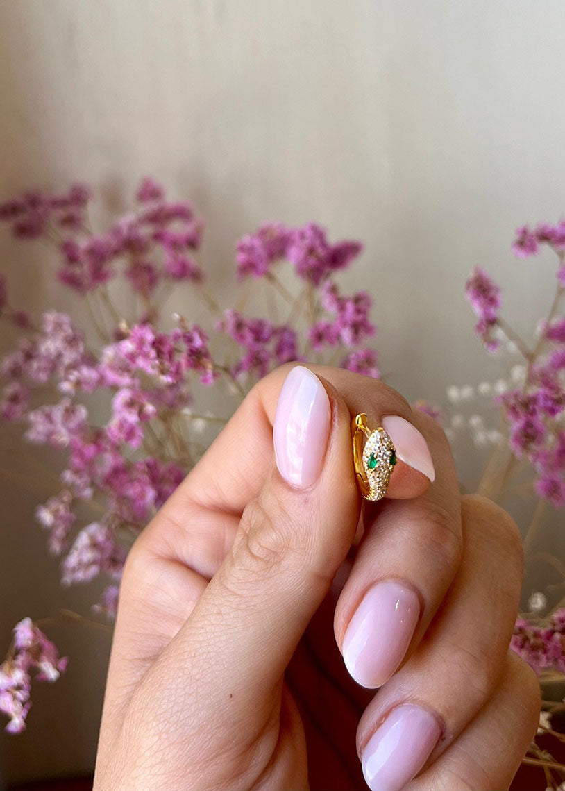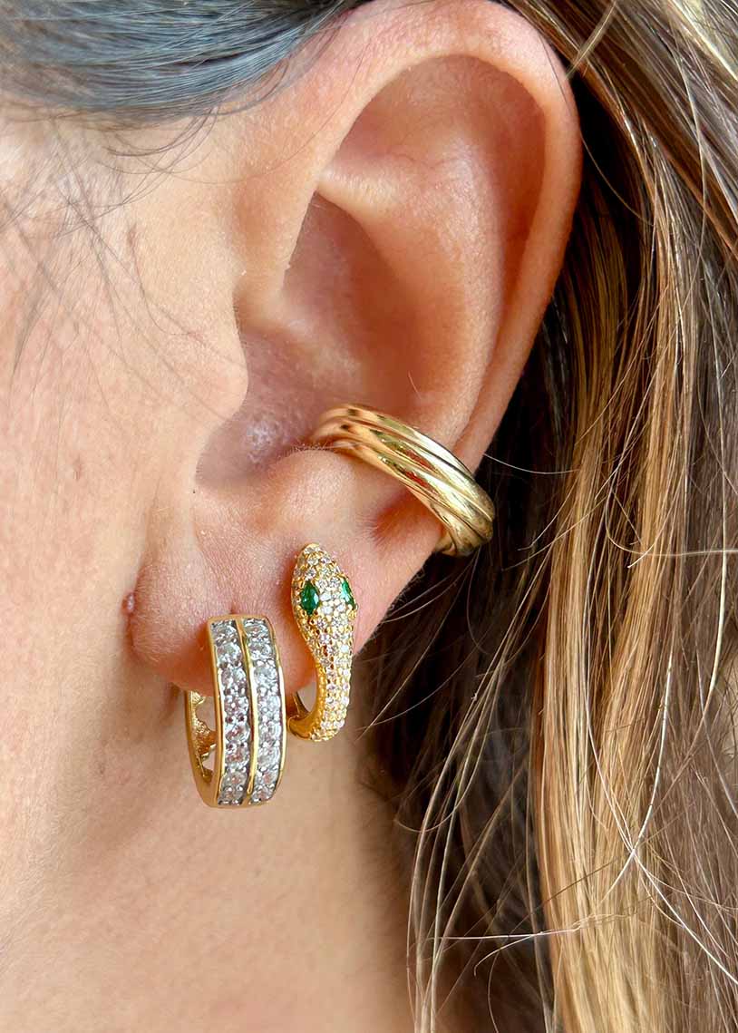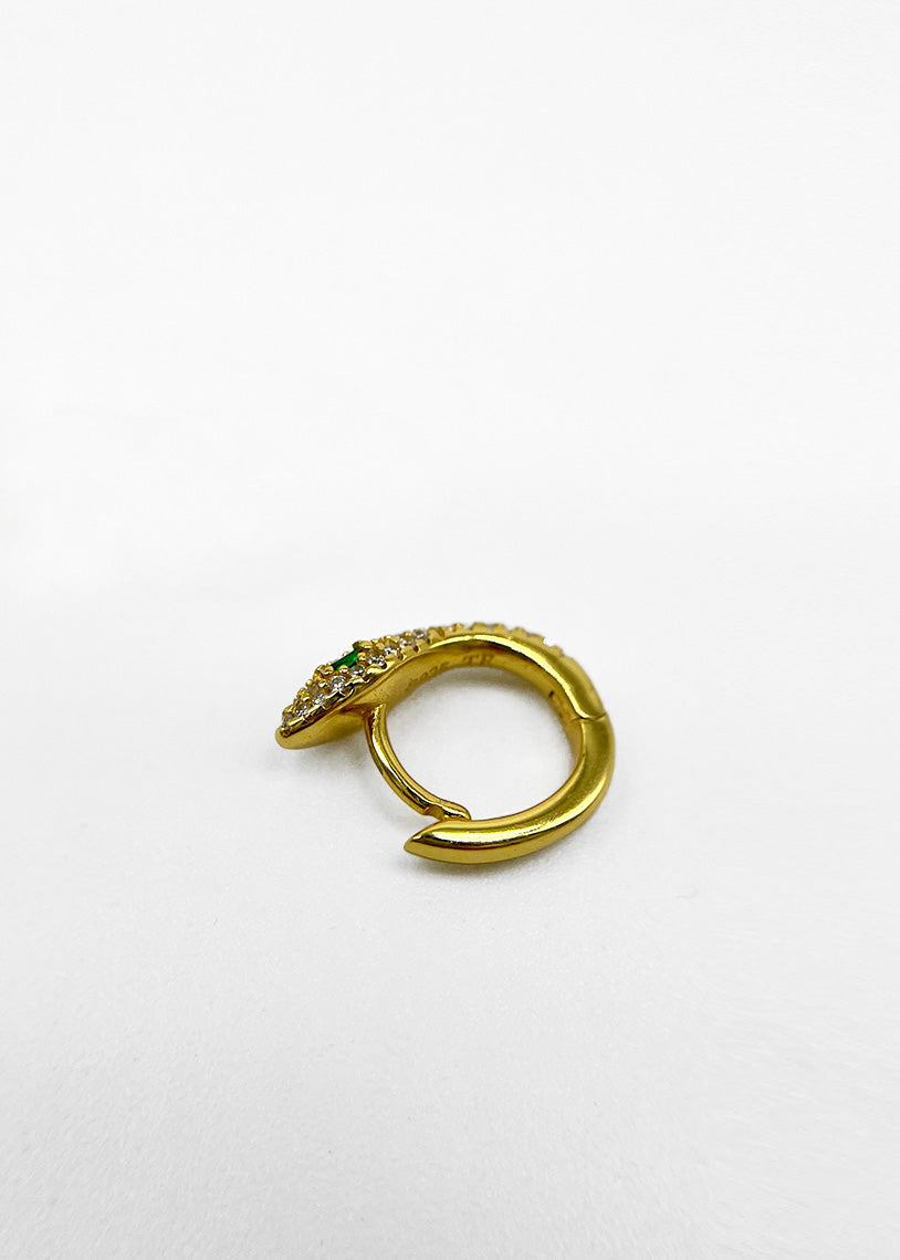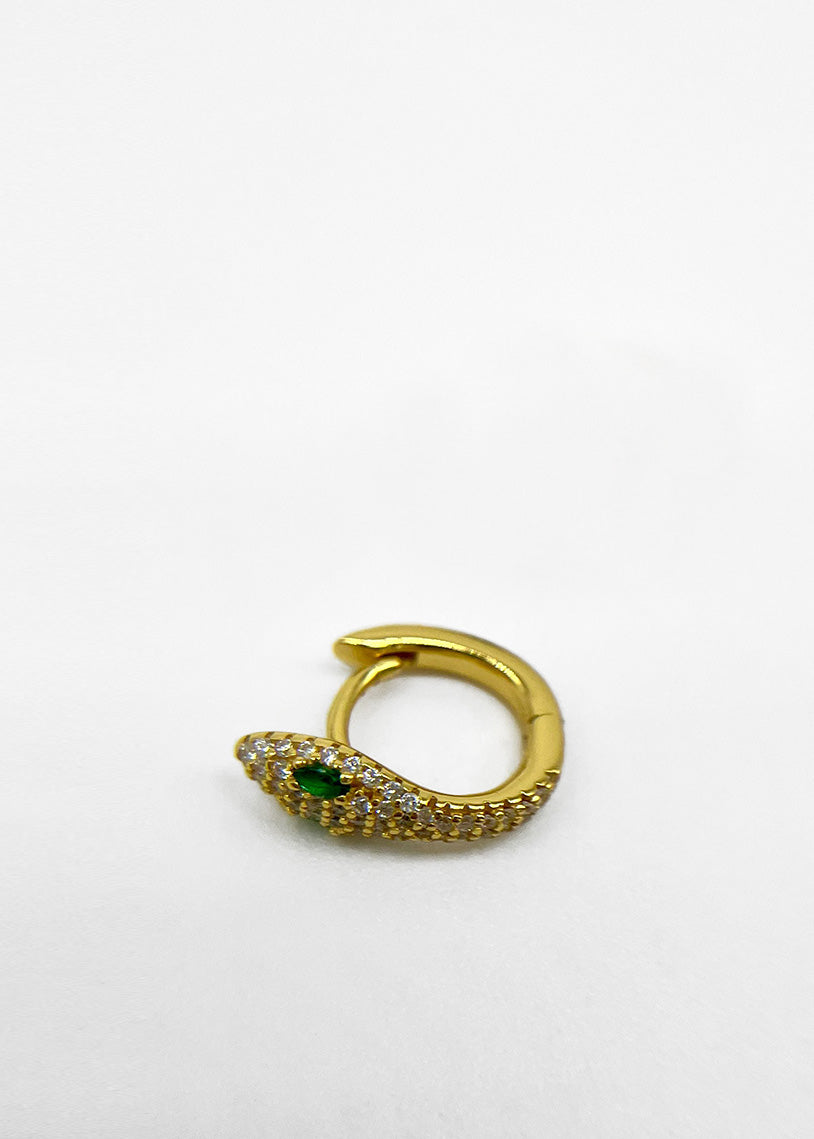 Il mono orecchino "Viper" è realizzato con una raffinata pavé di cubic zirconia che disegna un serpentino elegante. Due applicazioni con cubic zirconia verdi adornano gli occhi, aggiungendo un dettaglio prezioso e distintivo. La finitura in galvanica oro conferisce a Viper luminosità e resistenza, esaltando un design sofisticato ideale per chi desidera un accessorio unico e ricercato.