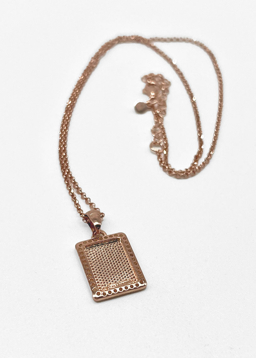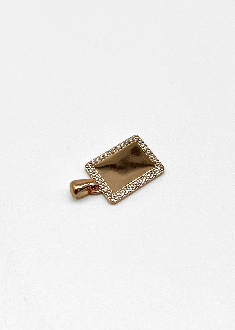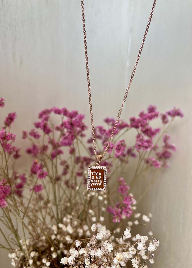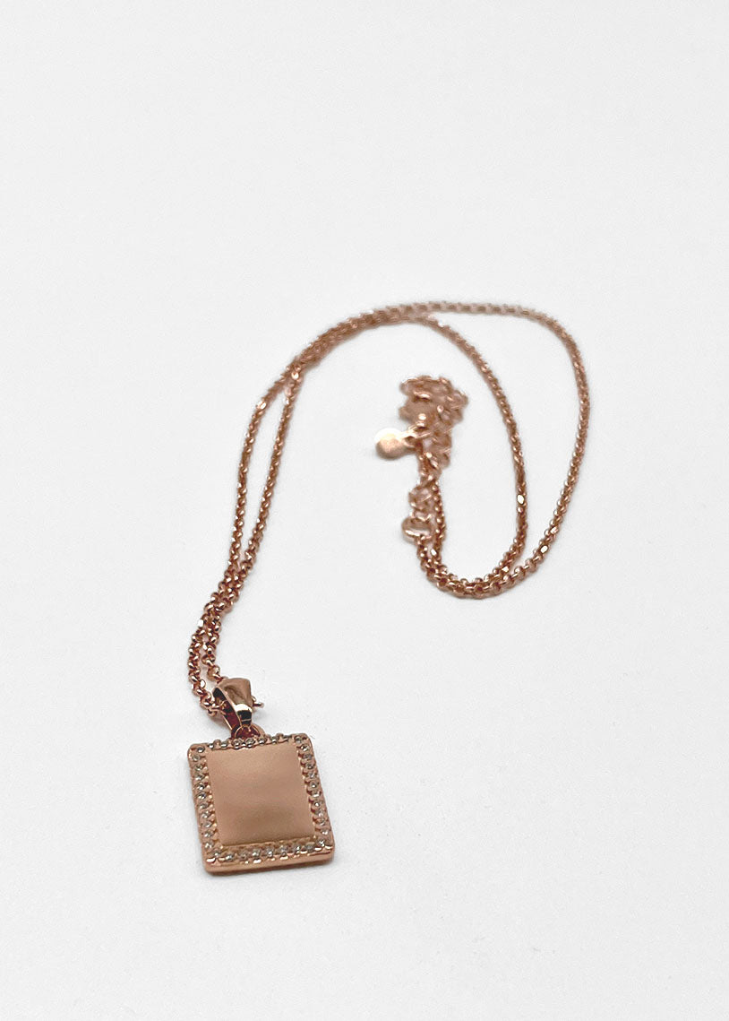 La placchetta Cutie Rosé, con la sua raffinata cornice di cubic zirconia, aggiunge un tocco di luminosità ed eleganza a ogni gioiello. Realizzata con galvanica rosé, è completamente personalizzabile con frasi, lettere o disegni, permettendo di creare un ricordo unico o un regalo emozionante. Il tempo di realizzazione è al massimo di 6 giorni lavorativi, garantendo cura e precisione artigianale.