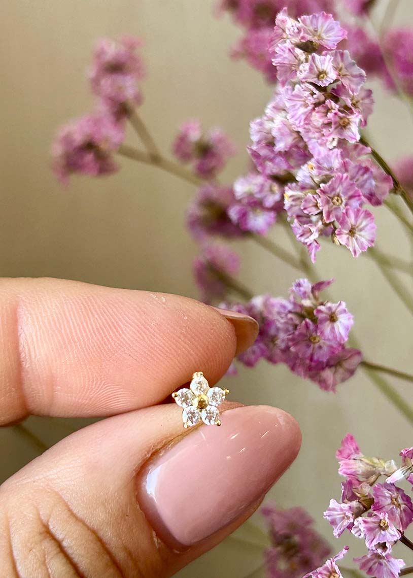 Daisy è un raffinato piercing in galvanica oro, progettato per chi cerca eleganza e qualità. Il gioiello a forma di fiore, arricchito da cubic zirconia, offre un brillante effetto luminoso che valorizza ogni look. La chiusura posteriore con avvitamento della pallina garantisce una tenuta sicura e confortevole, ideale per un uso quotidiano senza preoccupazioni. Questo piercing unisce design sofisticato e funzionalità, perfetto per chi desidera un accessorio prezioso e resistente nel tempo.