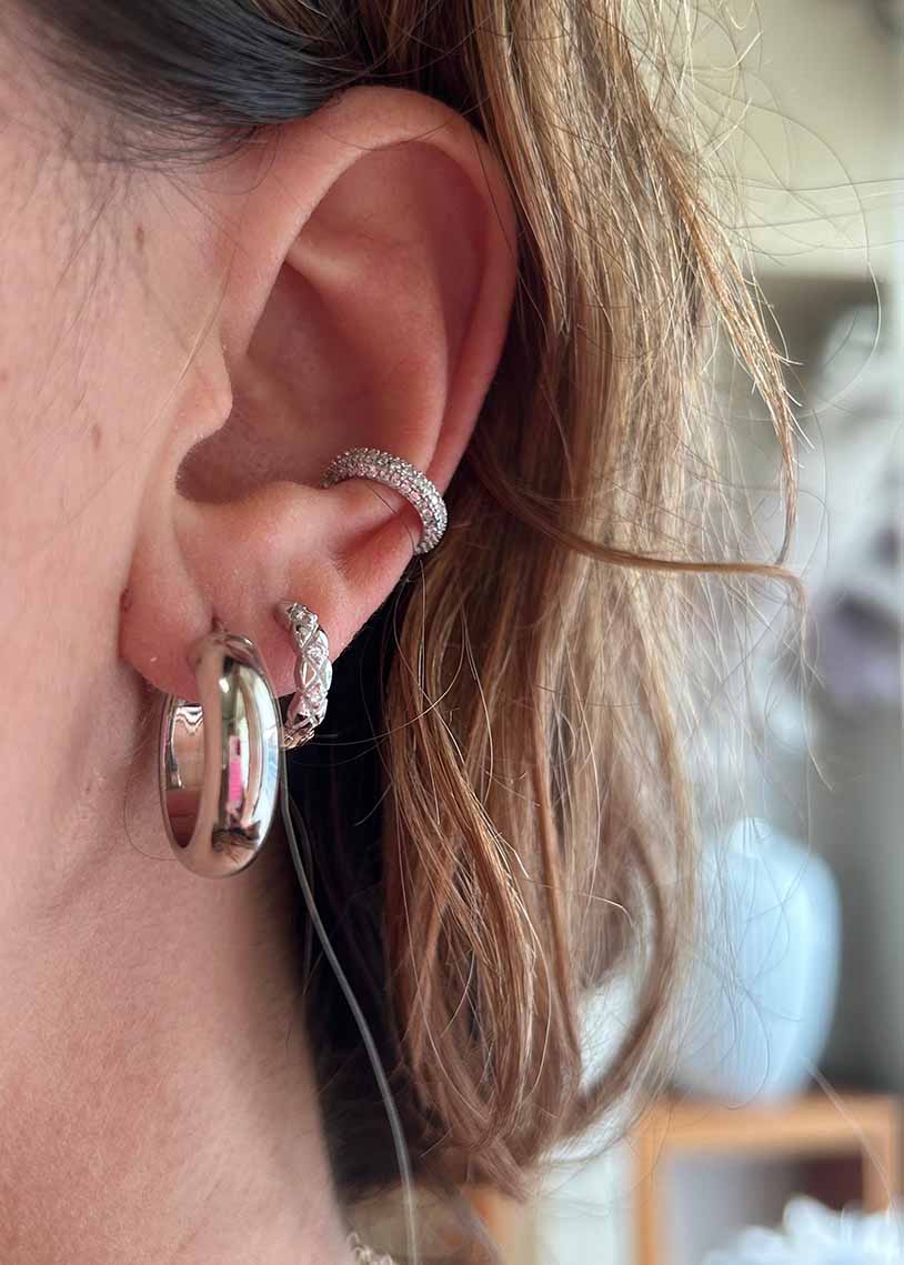 L'ear cuff Classic White si caratterizza per il pavé di cubic zirconia che riflette la luce con una brillantezza raffinata, valorizzando ogni particolare del design. La galvanica in rodio assicura al gioiello una luminosità duratura e una resistenza elevata, preservandone l’eleganza nel tempo. Questo accessorio, sofisticato ed elegante, è ideale per chi cerca un dettaglio di classe senza rinunciare alla praticità, grazie alla sua facile applicazione senza necessità di fori.