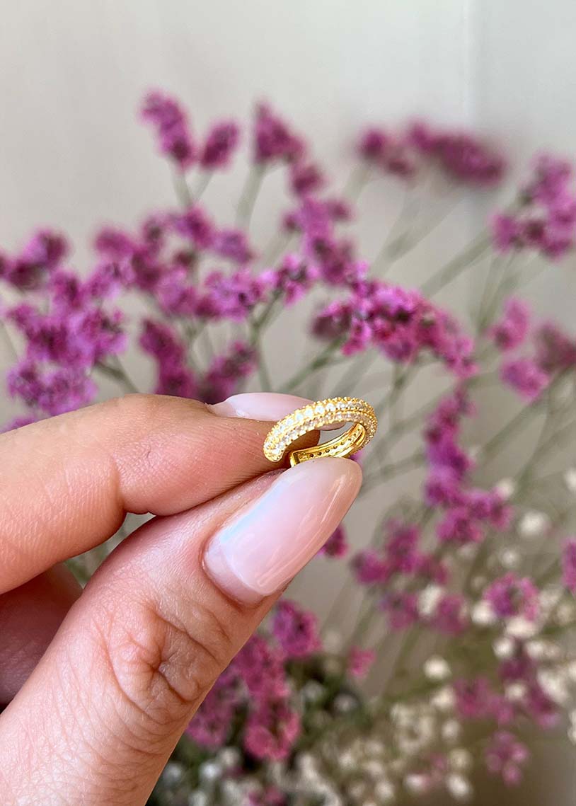 L'ear cuff Classic è impreziosito da un pavé di cubic zirconia e rifinito con galvanica oro, unendo eleganza e brillantezza in un design sofisticato.