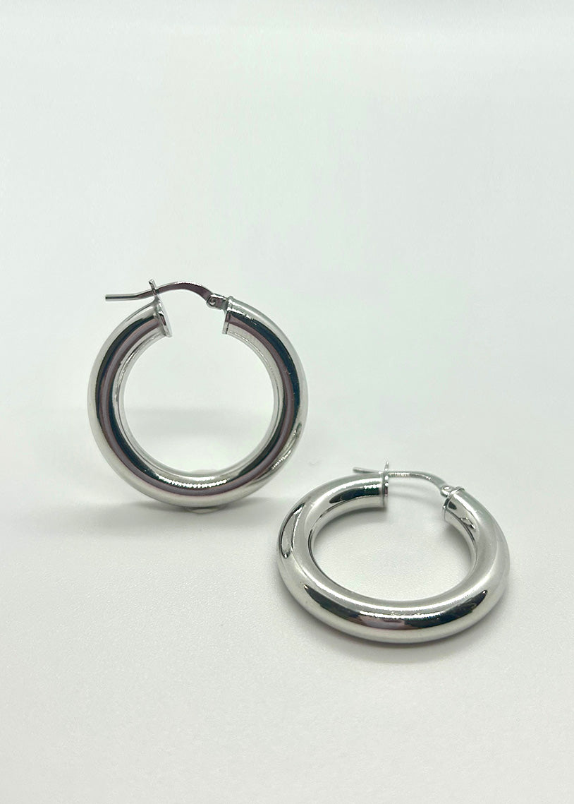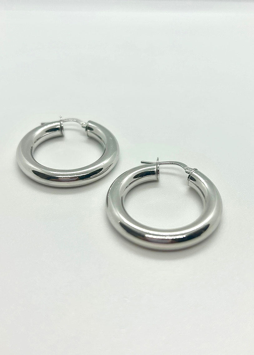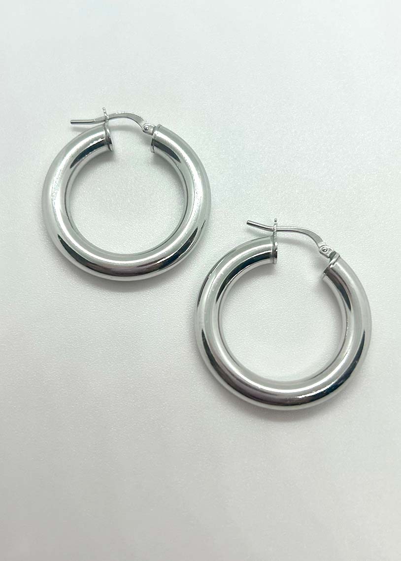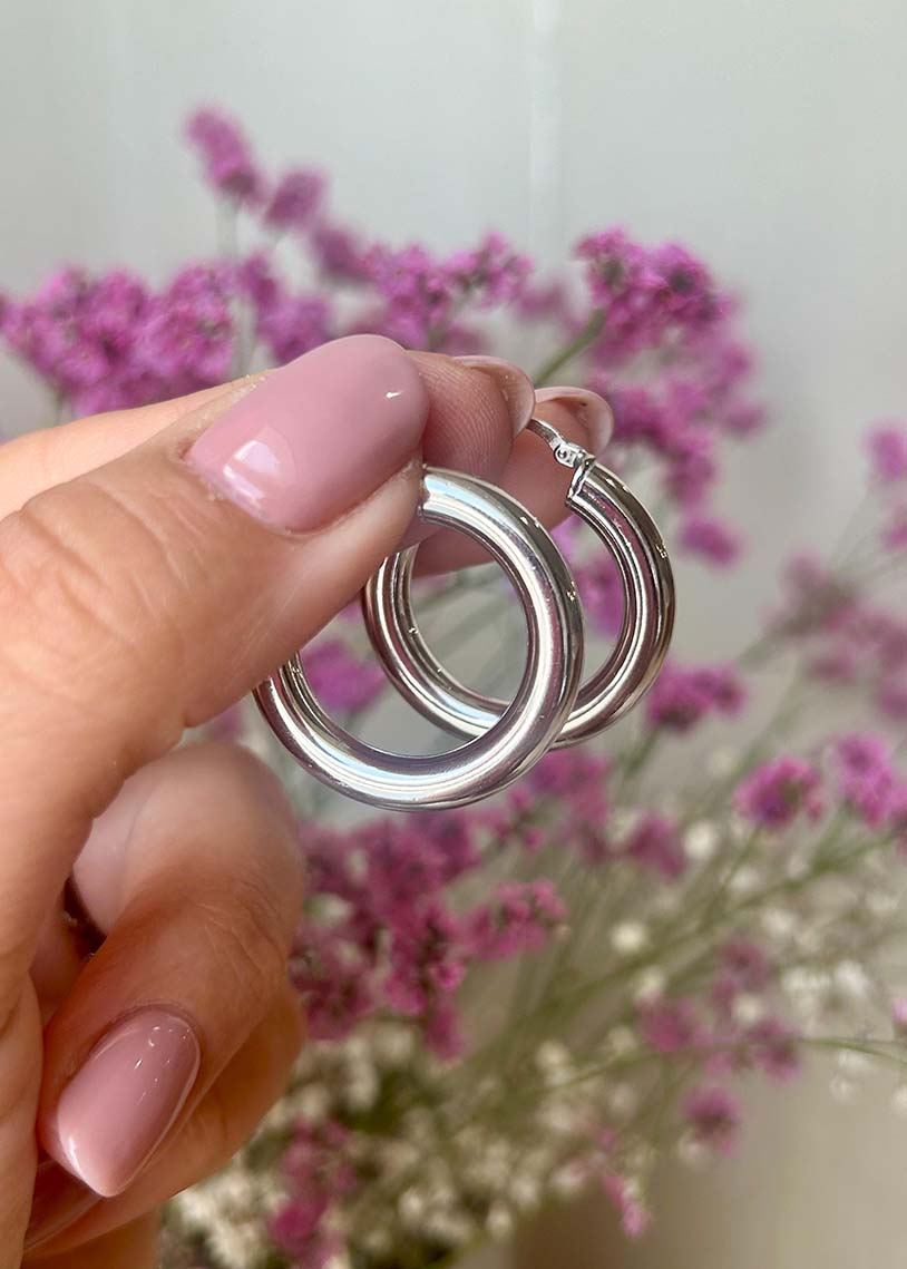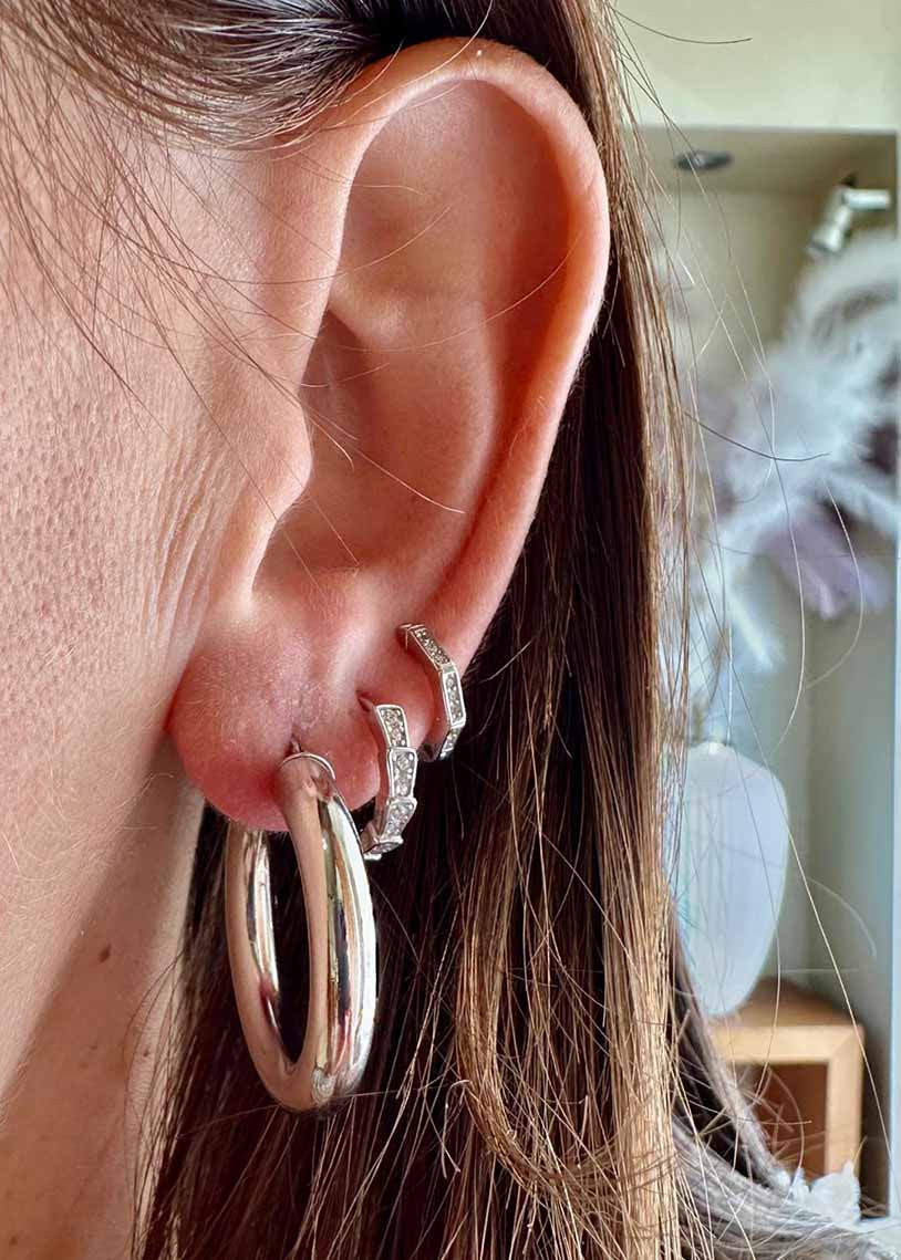Il cerchio Namibia White, con finitura galvanica bianca e un diametro di 2,95 cm, si distingue per la sua superficie liscia e il design ampio, ideale per chi cerca un gioiello elegante e moderno dal forte impatto visivo.
