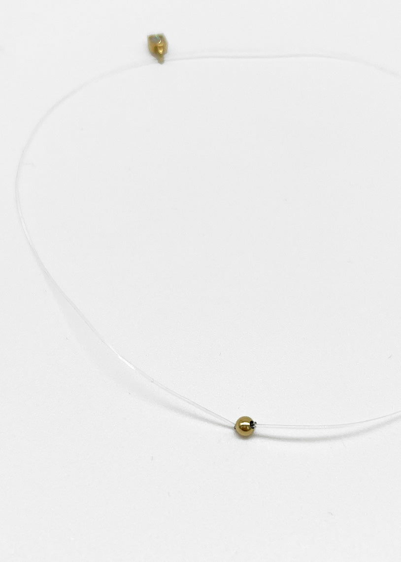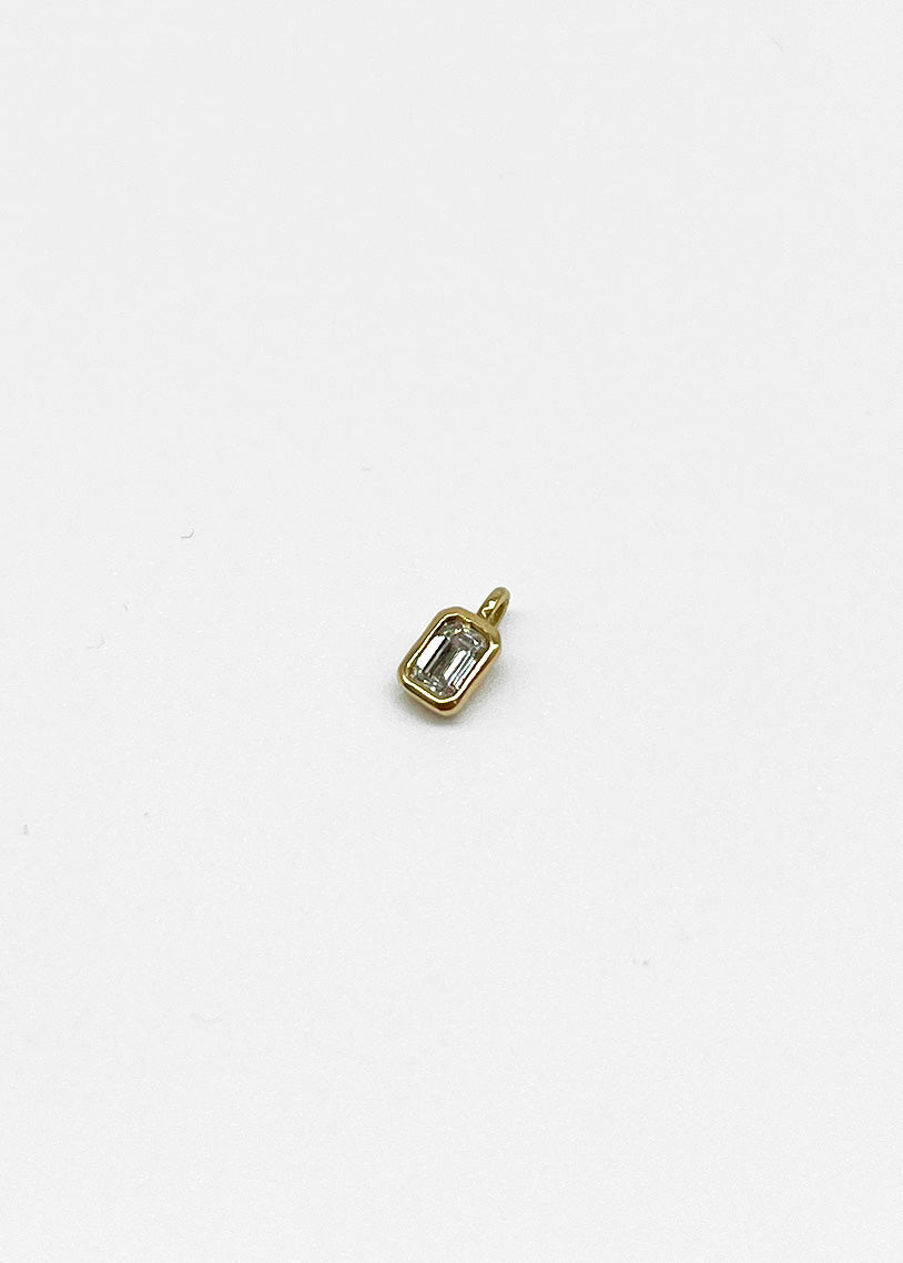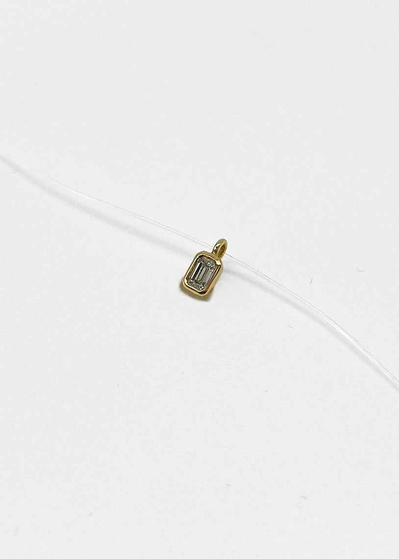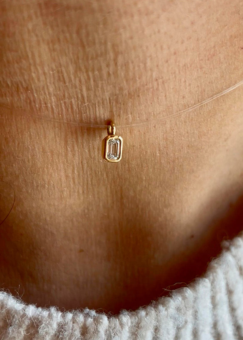 "Serenità": 0,23 KT diamante lab grown taglio smeraldo (con certificato internazionale) montato su castone, fatto a mano, basel setting in oro giallo 18 KT. Ciondolo pensato per essere indossato con filo lenza elasticizzato effetto chocker con sfera in oro giallo 18 KT come rifinitura per la copertura del nodino della lenza.